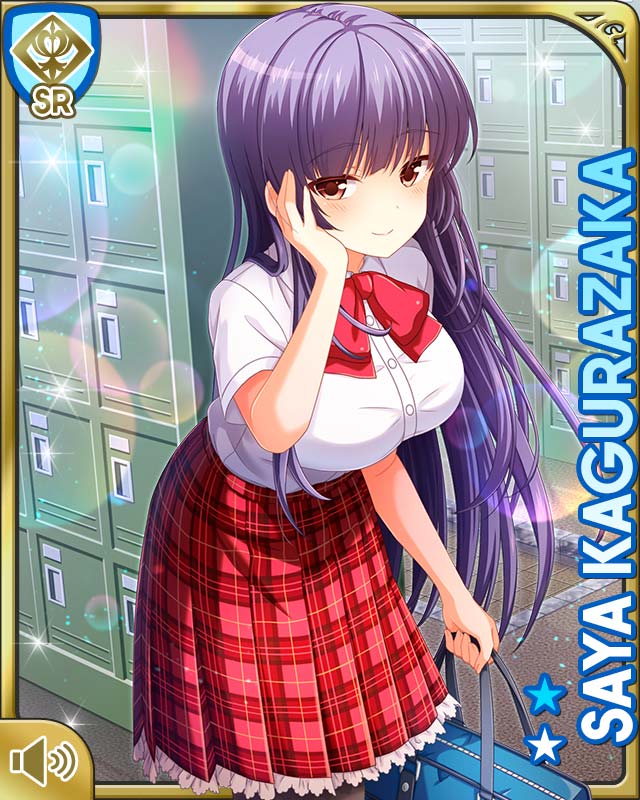 1girl bow brown_hair card_(medium) character_name closed_mouth day girlfriend_(kari) grey_legwear indoors kagurazaka_saya leggings locker locker_room long_hair looking_at_viewer official_art plaid_clothes plaid_skirt pleated_skirt purple_hair qp:flapper red_bow red_eyes red_skirt school school_uniform shirt short_sleeves skirt smile standing tagme white_shirt