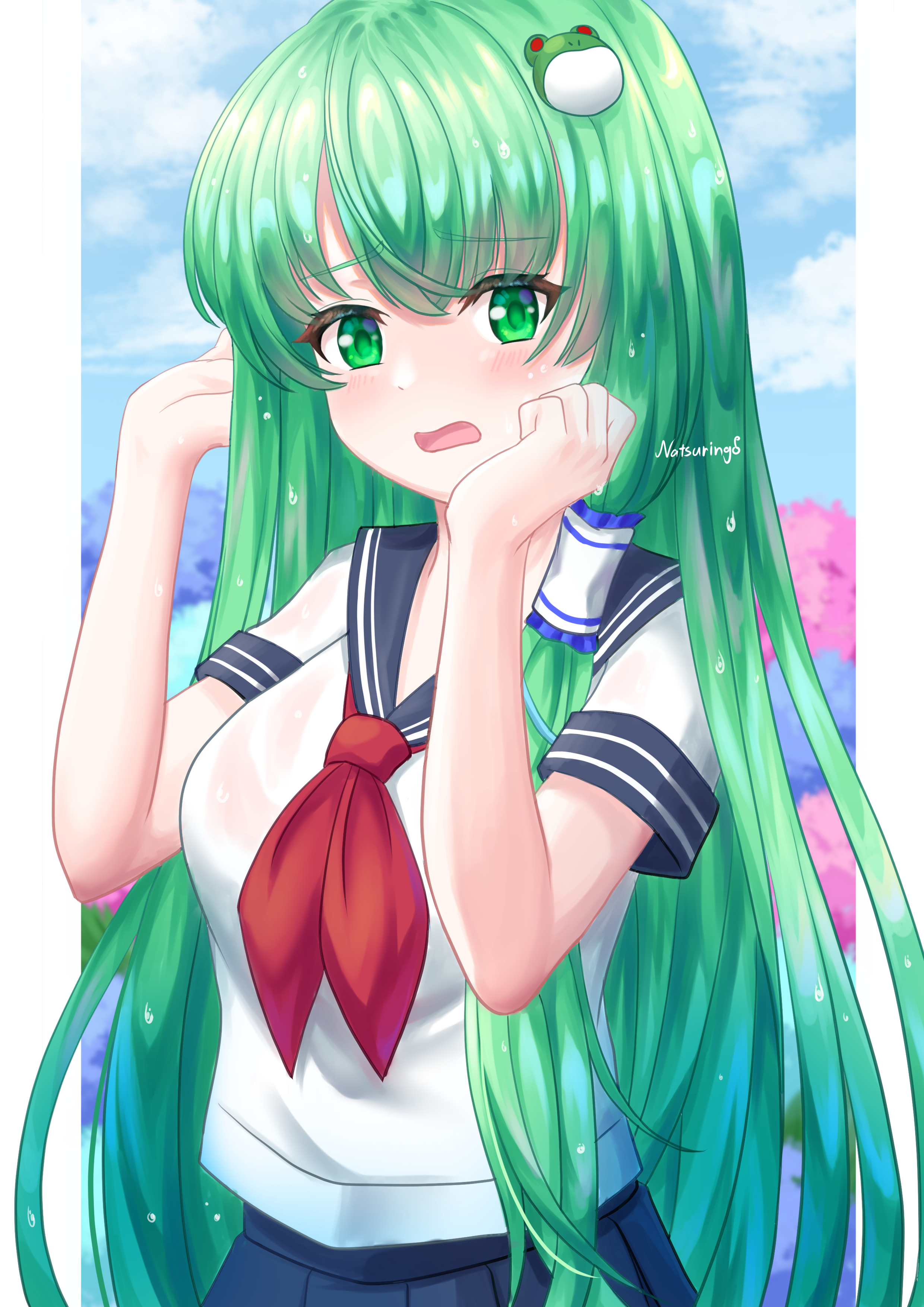 1girl absurdres blouse blue_sailor_collar blue_skirt blush breasts commentary_request frog_hair_ornament green_eyes green_hair hair_ornament hair_tubes highres kochiya_sanae long_hair medium_breasts natsuring0 neckerchief open_mouth outdoors pleated_skirt red_neckerchief sailor_collar sailor_shirt school_uniform serafuku shirt short_sleeves sidelocks skirt solo touhou upper_body very_long_hair white_shirt