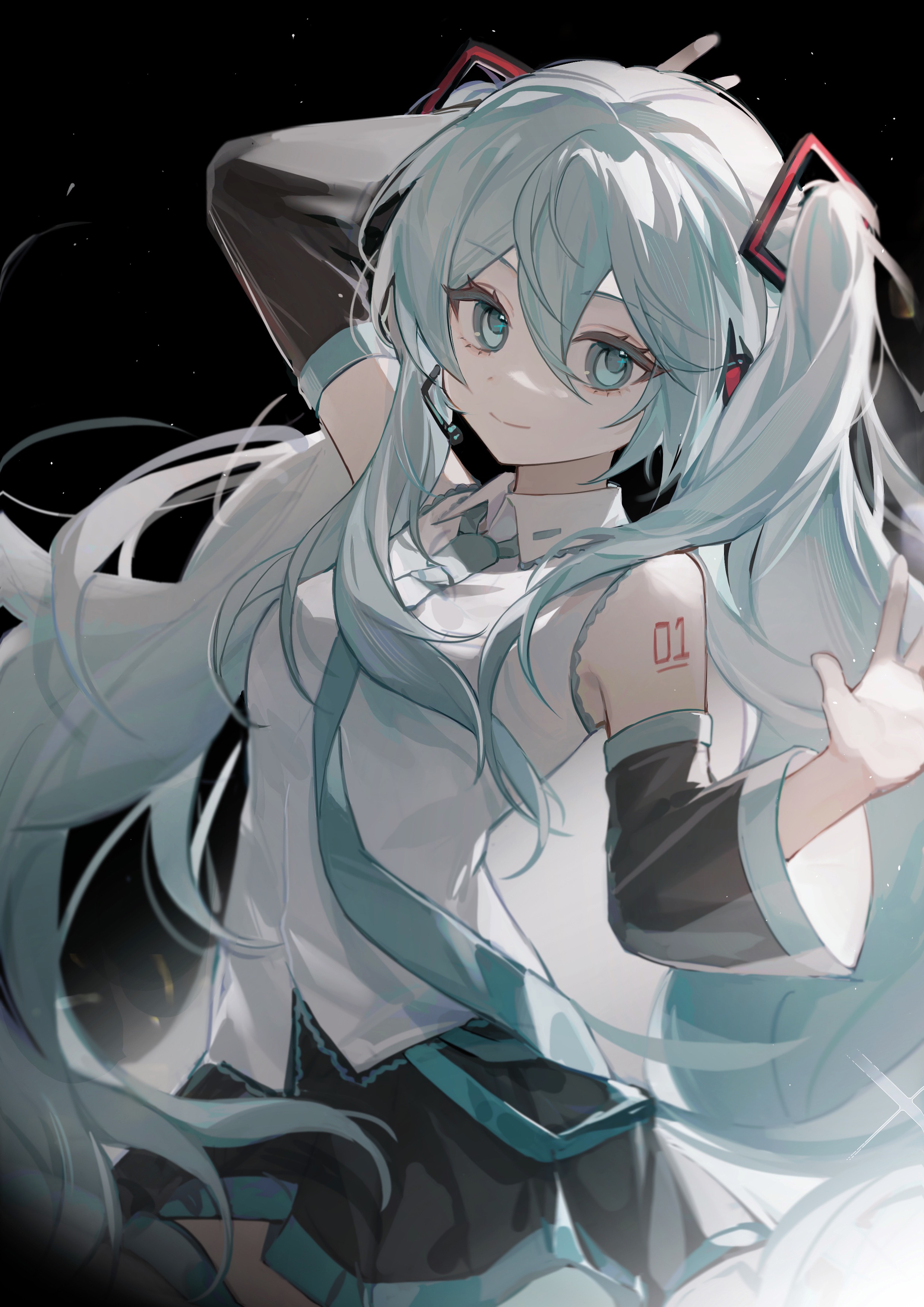 1girl absurdres aqua_eyes aqua_hair aqua_necktie black_skirt closed_mouth cowboy_shot detached_sleeves frills hatsune_miku highres hisakawa_sora light_particles long_hair multicolored_background necktie pleated_skirt shirt skirt sleeveless sleeveless_shirt smile solo vocaloid white_shirt