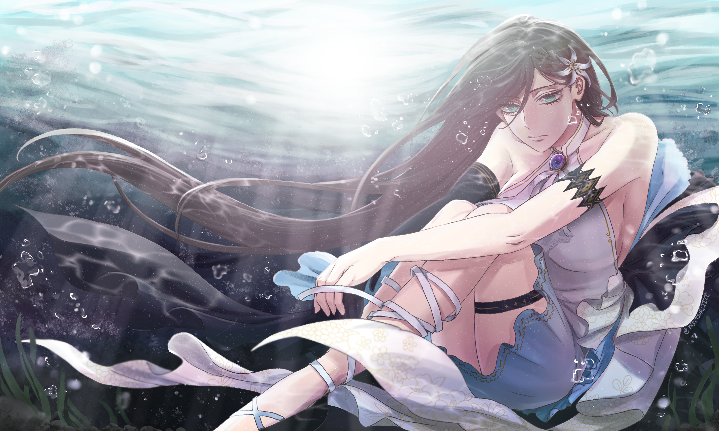 1girl bare_shoulders black_hair brunhilde_(shuumatsu_no_valkyrie) bubble flower green_eyes hair_flower hair_ornament highres long_hair looking_at_viewer shuumatsu_no_valkyrie solo sunlight underwater valkyrie very_long_hair water