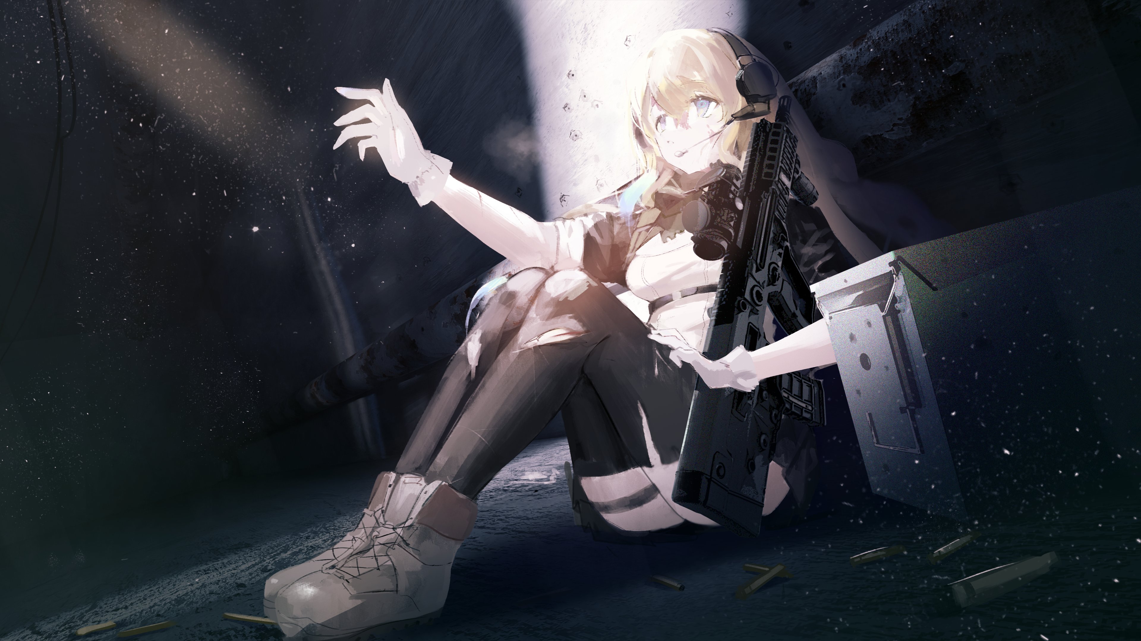 1girl 5.56x45mm_nato absurdres ammunition assault_rifle bandana black_thighhighs blonde_hair blue_eyes boots bullpup carbine carbine_cartridge commentary commission dmr_cartridge dori_(artist) english_commentary full_body gloves gradient_hair grey_boots gun headset highres indie_virtual_youtuber intermediate_cartridge iwi_tavor iwi_x95 lace-up_boots lmg_cartridge multicolored_hair rifle rifle_cartridge second-party_source shell_casing sitting solo thighhighs virtual_youtuber weapon weapon_request zeta_(vtuber) zeta_(1st_costume)_(vtuber)
