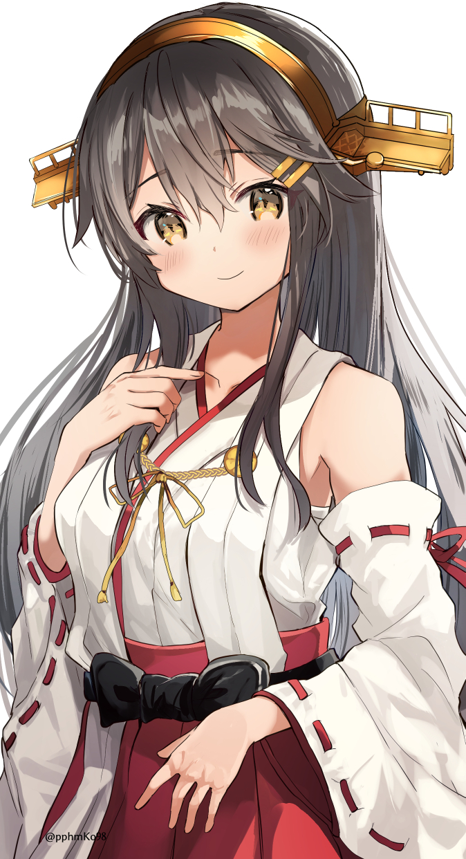 1girl black_hair cowboy_shot dazzle_paint detached_sleeves hair_ornament hairband hairclip hand_on_own_chest haruna_(kancolle) headgear highres japanese_clothes kantai_collection long_hair looking_at_viewer nanahamu ribbon-trimmed_sleeves ribbon_trim smile solo yellow_eyes