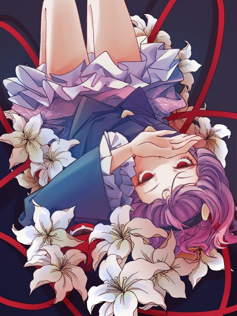 1girl black_hairband blue_shirt buttons covering_own_mouth floral_print flower frilled_skirt frilled_sleeves frills hair_ornament hairband hand_up heart heart_button heart_hair_ornament komeiji_satori lily_(flower) long_sleeves looking_at_viewer lying on_back pink_skirt purple_hair red_eyes rose_print shirt short_hair skirt solo third_eye touhou upside-down white_flower wide_sleeves zhihuaiqiang