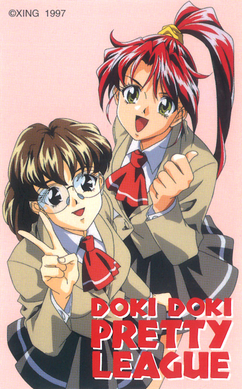 1990s_(style) 2girls ascot black_eyes blazer brown_hair copyright_name copyright_notice doki_doki_pretty_league high_ponytail jacket long_sleeves looking_at_viewer miniskirt multiple_girls non-web_source official_art open_mouth pink_background pleated_skirt ponytail red_hair retro_artstyle rimless_eyewear round_eyewear scan school_uniform simple_background skirt thumbs_up v yellow_eyes
