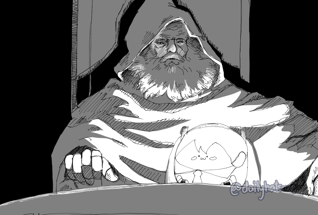 1boy 1girl :3 beard blush cloak detached_sleeves facial_hair glowing greyscale hairband hatsune_miku hood hood_up light looking_ahead looking_at_another meme monochrome mustache necktie no_nose odakuram old old_man pensive pondering_my_orb_(meme) tumblr_username twintails vocaloid watermark