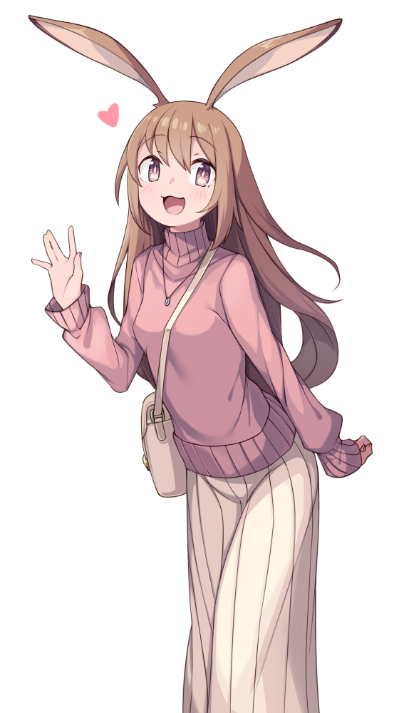 1girl :d animal_ears artworks/80436175 bag blush breasts brown_hair casual commentary handbag jewelry leaning_forward long_hair long_skirt long_sleeves looking_at_viewer necklace open_mouth original pink_sweater pleated_skirt purple_eyes rabbit_ears rabbit_girl ribbed_sweater saiste shoulder_bag skirt sleeves_past_wrists small_breasts smile solo sweater turtleneck turtleneck_sweater waving white_background white_skirt