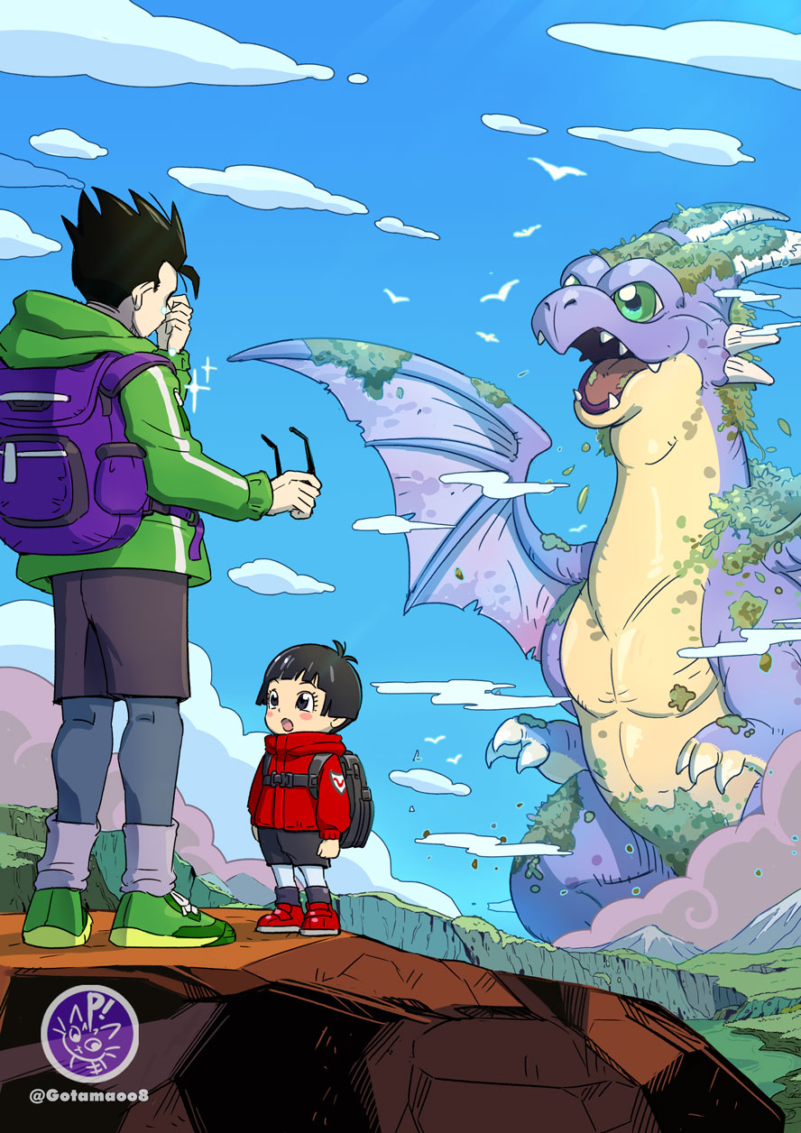1boy 1girl :o artist_logo backpack bag black-framed_eyewear black_bag black_eyes black_hair black_shorts blue_legwear blush_stickers child commentary_request dragon dragon_ball dragon_ball_super dragon_ball_super_super_hero dragonball_z dust father_and_child father_and_daughter glasses green_eyes green_footwear green_jacket hand_on_own_face highres holding holding_removed_eyewear hood hooded_jacket horns icarus_(dragon_ball) jacket leg_warmers logo looking_at_another looking_up moss norita_(6110885) open_mouth pan_(dragon_ball) parent_and_child purple_bag red_footwear red_jacket shoes short_hair shorts son_gohan spiked_hair standing tears twitter_username unworn_eyewear wings