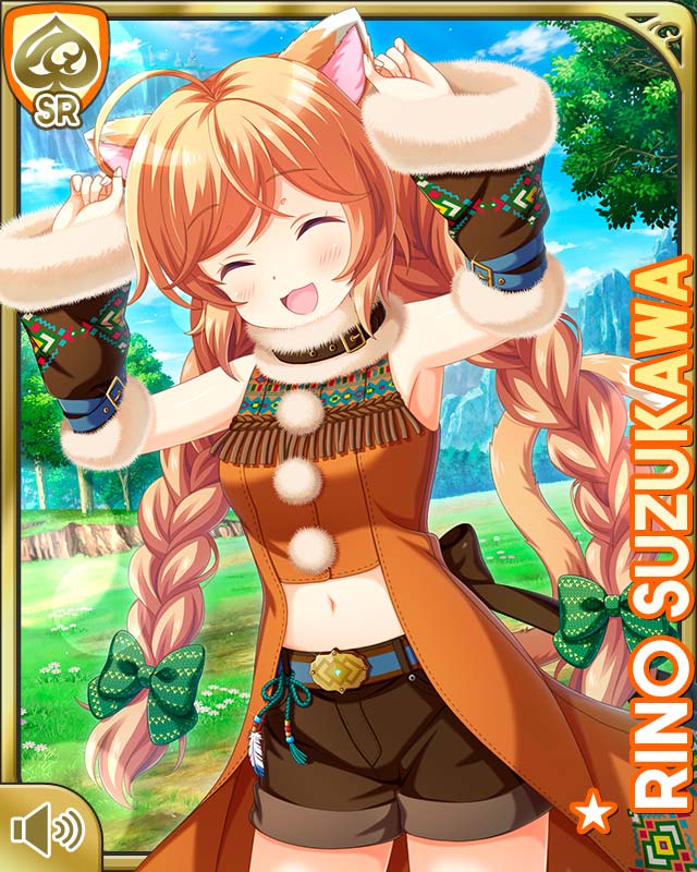 1girl :d ahoge belt bow braid brown_hair brown_shorts card_(medium) cat_girl character_name day detached_sleeves closed_eyes forest girlfriend_(kari) green_bow hair_bow hair_ribbon nature navel official_art open_mouth orange_shirt outdoors polka_dot polka_dot_bow purple_eyes qp:flapper ribbon shirt shorts smile solo suzukawa_rino twin_braids video_game