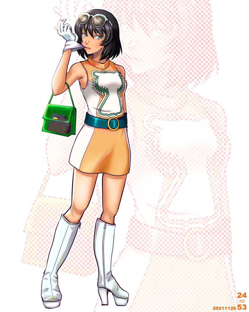 1girl animal_print artist_logo bag belt black_belt black_hair bob_cut boots carrying casual commentary dark-skinned_female dark_skin dated elbow_carry eyewear_on_head full_body girls_und_panzer glove_pull gloves green-framed_eyewear green_eyes handbag high_heel_boots high_heels hoshino_(girls_und_panzer) knee_boots leopon_(animal) logo looking_at_viewer miniskirt mouth_hold nishi_itsumi orange_shirt orange_skirt shirt short_hair skirt sleeveless sleeveless_shirt solo standing sunglasses white_boots white_gloves zoom_layer