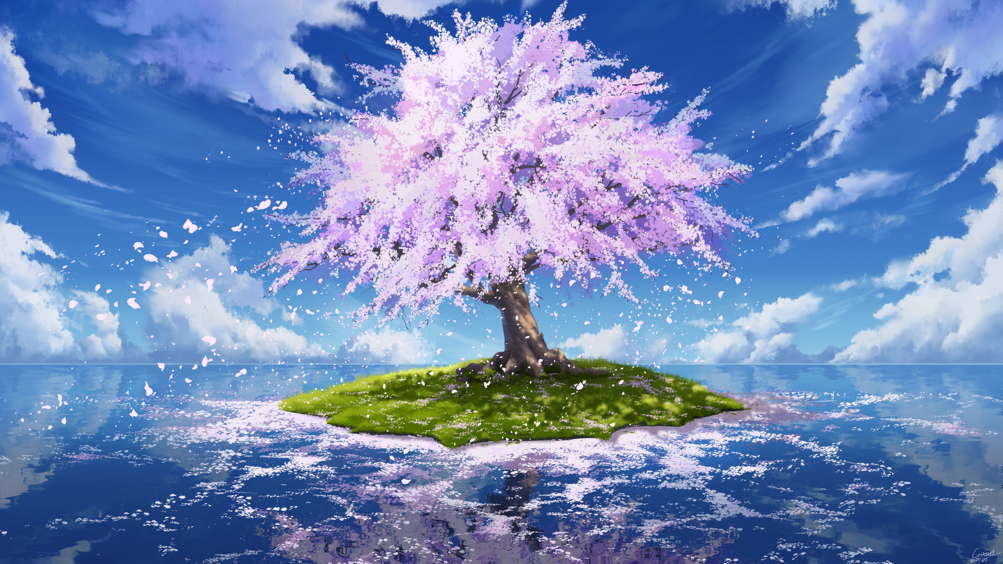 absurdres blue_sky bread_fqy cherry_blossoms cloud commentary_request grass highres no_humans ocean original outdoors reflection scenery sky tree water