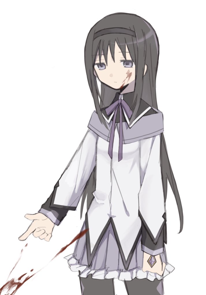 1girl akemi_homura akemi_homura_(magical_girl) argyle_clothes argyle_pantyhose black_hair black_hairband black_pantyhose black_shirt black_trim blood blood_on_face capelet collared_shirt comet543 cowboy_shot expressionless frilled_skirt frills gem hair_between_eyes hairband jewelry jitome long_hair long_sleeves magical_girl mahou_shoujo_madoka_magica mahou_shoujo_madoka_magica_(anime) neck_ribbon pantyhose pleated_skirt purple_capelet purple_eyes purple_gem purple_ribbon purple_skirt ribbon shirt sidelocks simple_background skirt solo soul_gem very_long_hair vest white_background white_vest wing_collar