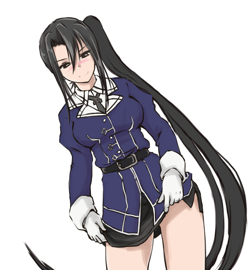 1girl absurdly_long_hair black_hair black_ribbon black_skirt brown_eyes commentary_request cowboy_shot gloves holding_own_skirt jacket kantai_collection long_hair masamori_ikemo military military_uniform nachi_(kancolle) neck_ribbon pencil_skirt purple_jacket ribbon side_ponytail simple_background skirt solo standing very_long_hair white_background white_gloves