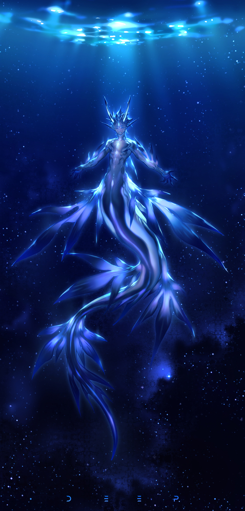 1boy arsh_(thestarwish) blue_background blue_hair blue_skin blue_theme bubble closed_eyes colored_skin completely_nude dorsal_fin english_text fins full_body glaucus_atlanticus glowing horns male_focus mermaid merman monster_boy monster_girl nude open_mouth original outstretched_arms pointy_ears refraction short_hair smile solo underwater
