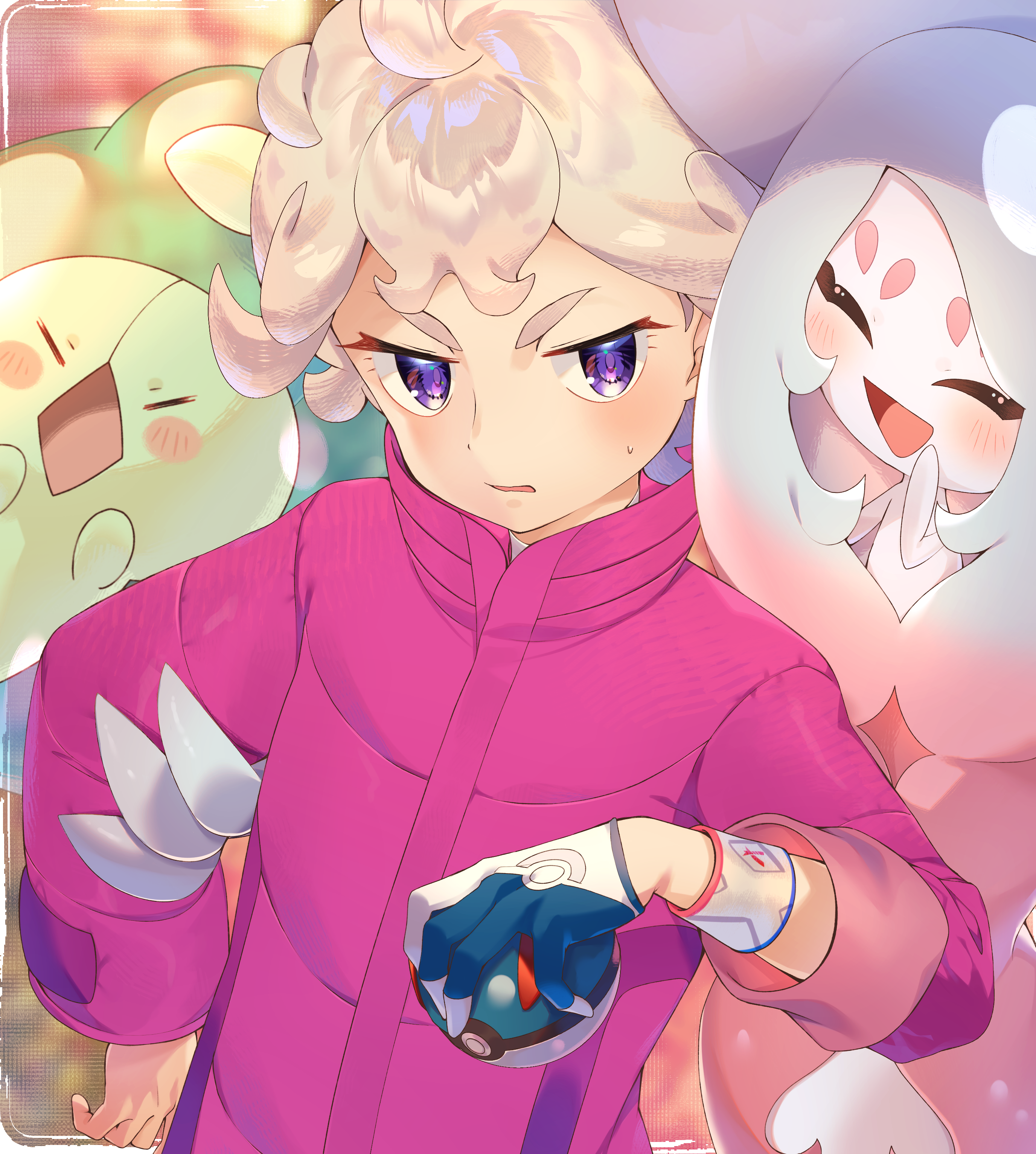 1boy absurdres ahoge bede_(pokemon) blonde_hair blush coat commentary_request curly_hair dynamax_band gen_5_pokemon gen_8_pokemon gloves great_ball hand_on_own_hip hand_up hatterene highres holding holding_poke_ball male_focus nintendo poke_ball pokemon pokemon_swsh purple_coat purple_eyes reuniclus short_hair single_glove sleeves_rolled_up sweatdrop yupiteru
