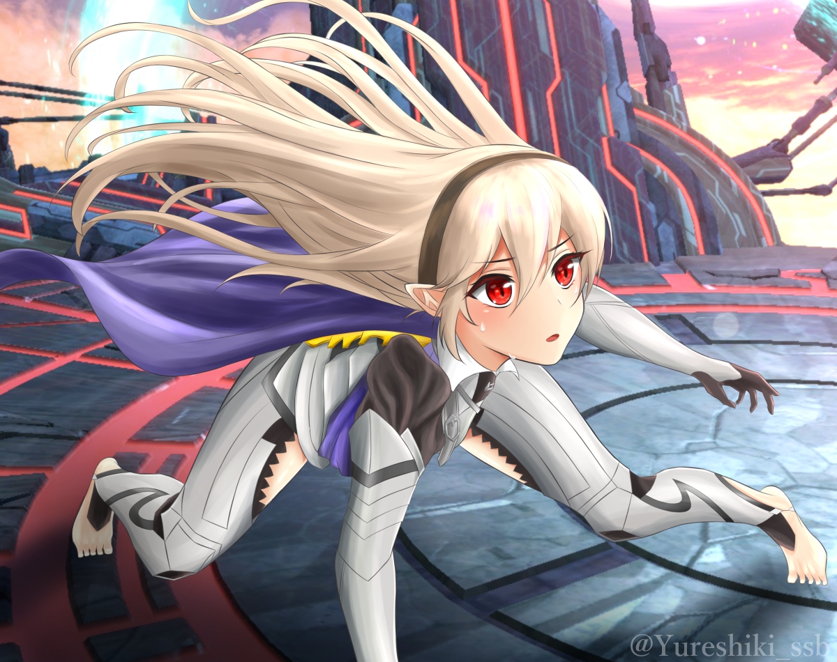 1girl blonde_hair cape female_corrin_(fire_emblem) final_destination_(smash_bros) fire_emblem hairband long_hair nintendo pointy_ears red_eyes slit_pupils solo yureshiki_ssb