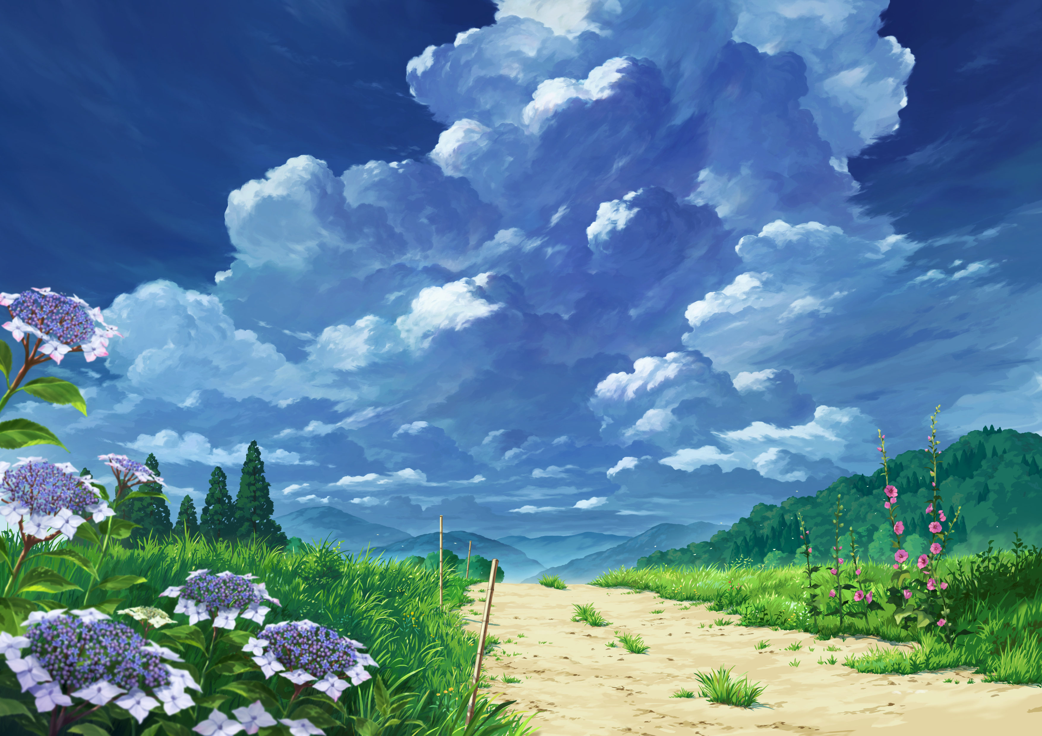 absurdres bow cloud cloudy_sky commentary cumulonimbus_cloud day flower forest grass hat highres hollyhock hydrangea ice ice_wings mountainous_horizon nature no_humans original outdoors path pink_flower purple_flower road sasaj scenery short_hair sky solo straw_hat summer tree vanishing_point very_wide_shot white_flower wings
