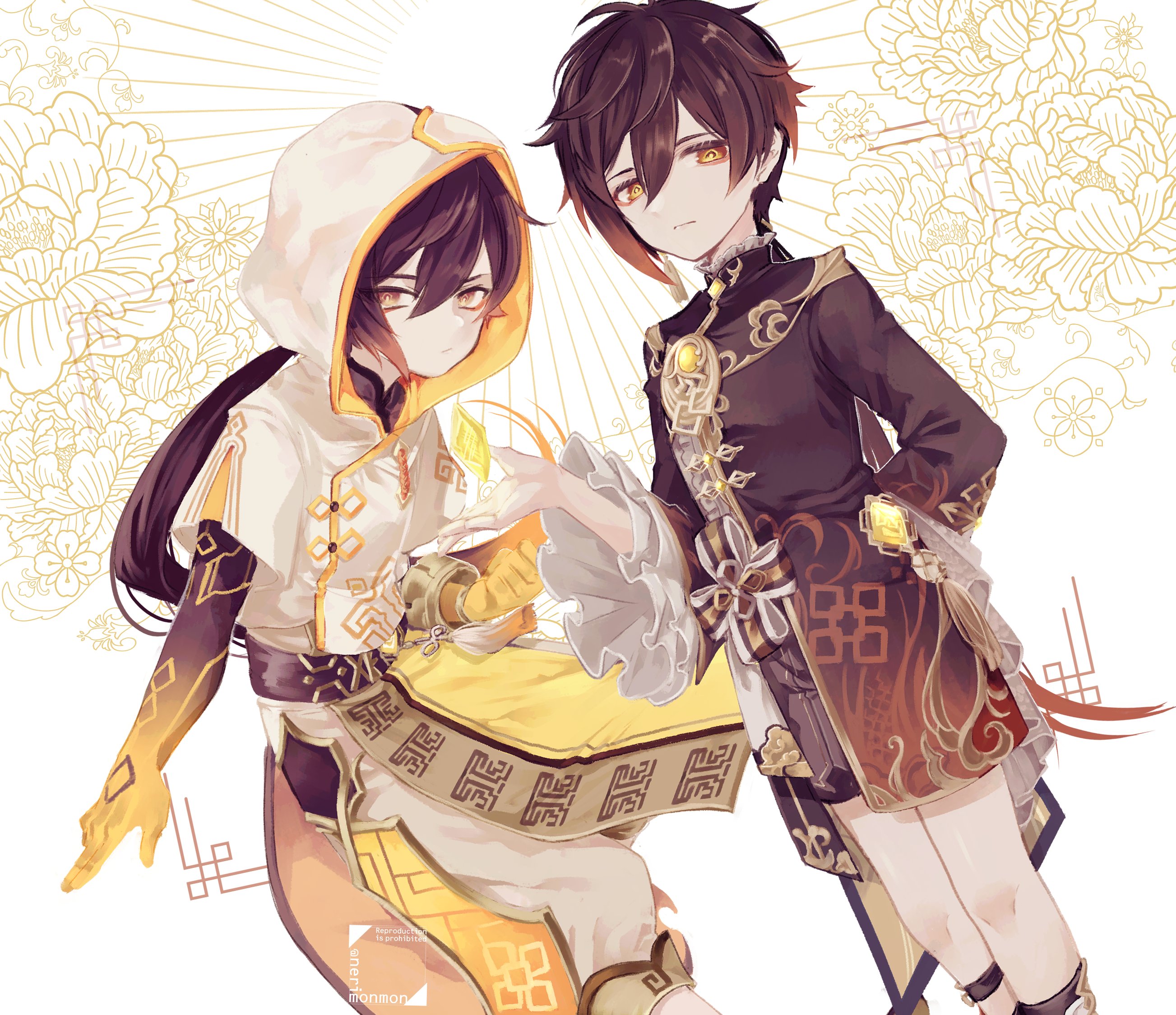 1boy aged_down arm_behind_back arm_tattoo black_hair brown_hair child chongyun_(genshin_impact) closed_mouth earrings floating floating_object floral_print formal_clothes frilled_shirt_collar frilled_sleeves frills genshin_impact gradient_hair hair_between_eyes highres hood hood_up hooded_jacket jacket jewelry long_hair long_sleeves looking_at_viewer male_focus multicolored_hair nerimono_(nekokoban22) ponytail single_earring suit tassel tassel_earrings tattoo vision_(genshin_impact) xingqiu_(genshin_impact) yellow_eyes zhongli_(archon)_(genshin_impact) zhongli_(genshin_impact)