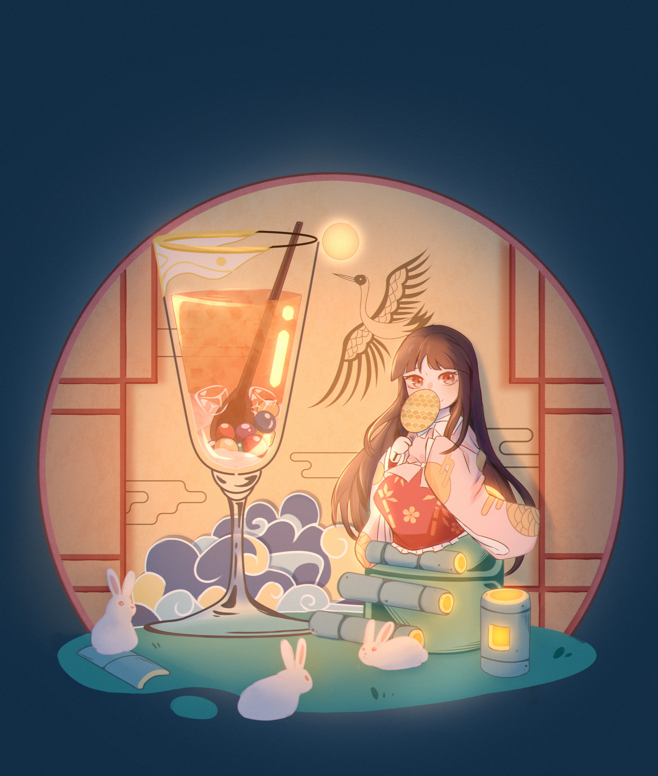 1girl absurdres bamboo black_hair blush bow bowtie chibi chinese_commentary closed_mouth commentary cup drink drinking_glass eyebrows_hidden_by_hair frilled_skirt frills grass hand_fan highres hime_cut holding holding_fan houraisan_kaguya ice ice_cube long_hair long_sleeves looking_at_viewer luqingtaofeixing pink_shirt rabbit red_eyes red_skirt shirt sitting skirt smile solo spoon touhou trigram very_long_hair white_bow white_bowtie wide_sleeves