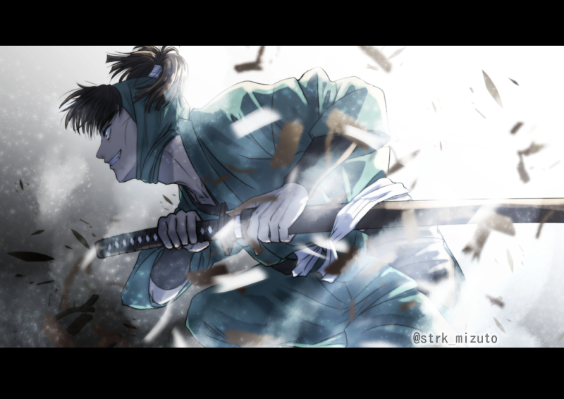1boy arm_guards backlighting black_hair clothing_cutout debris from_side green_headwear grin hair_tubes high_ponytail hip_vent hood japanese_clothes katana letterboxed long_sleeves looking_away male_focus motion_blur ninja pants ponytail profile rakudai_ninja_rantarou sash shards sheath shioe_monjirou smile solo squatting strk_mizuto sword twitter_username unsheathing weapon white_background