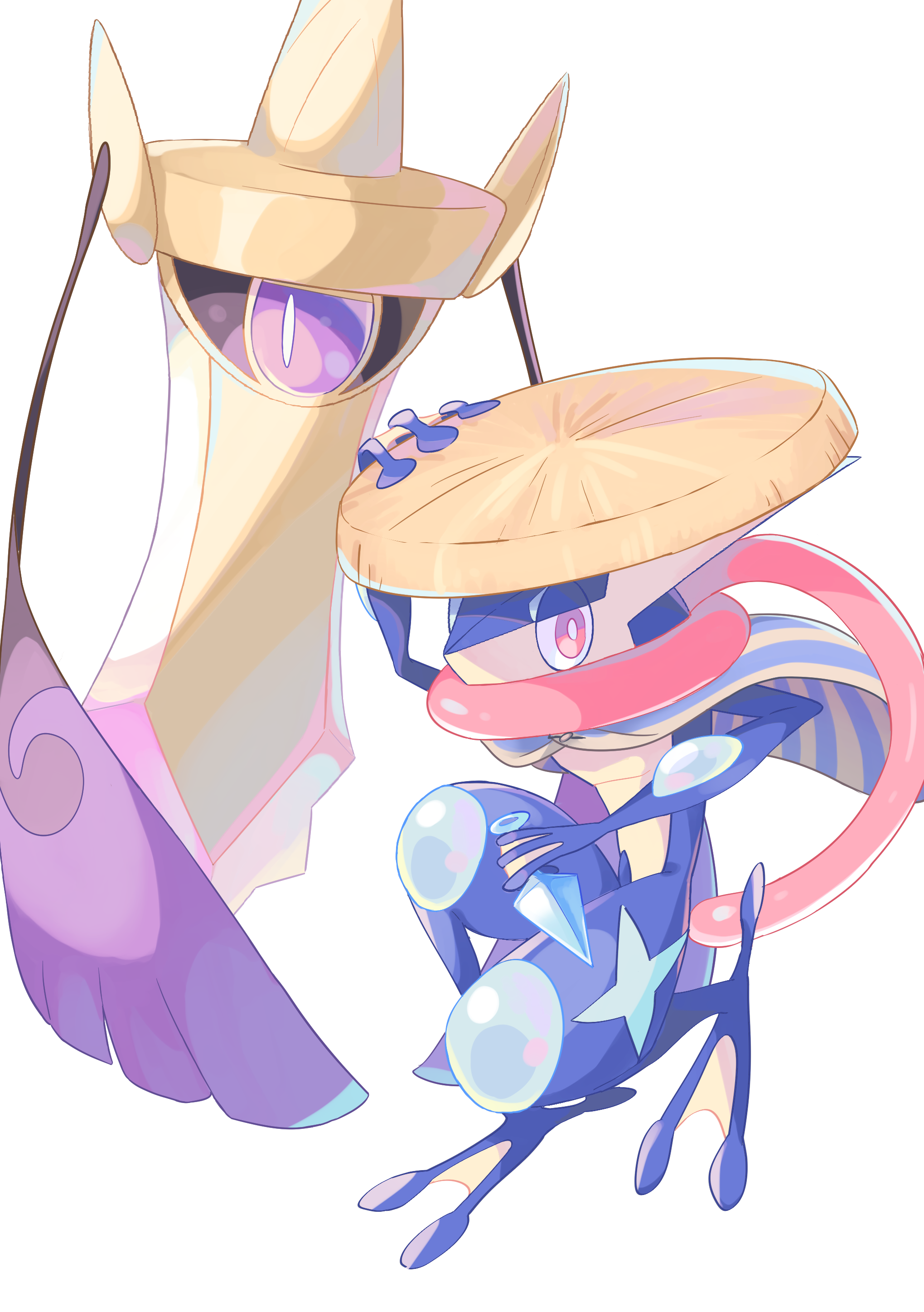1other absurdres adjusting_clothes adjusting_headwear aegislash arm_up black_sclera blue_skin bright_pupils cape colored_sclera colored_skin dagger full_body furry gen_6_pokemon greninja half-closed_eyes highres holding holding_dagger holding_knife holding_weapon knife kunai long_tongue looking_at_viewer looking_to_the_side multicolored_cape multicolored_skin nintendo one-eyed pokemon pokemon_(creature) purple_eyes red_eyes sandogasa simple_background squatting squid_(pixiv_27814354) striped_cape sword tongue tongue_out two-tone_skin weapon webbed_feet webbed_hands white_background white_pupils yellow_headwear yellow_skin