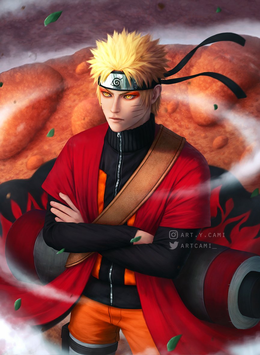 1boy animal artcami blonde_hair closed_mouth coat commentary_request crossed_arms dust facial_mark forehead_protector frog horizontal_pupils instagram_username leaf male_focus naruto_(series) naruto_shippuuden ninja open_mouth oversized_animal red_coat scroll scroll_tube sennin_mode short_hair slit_pupils smoke solo_focus standing toad_(animal) toned twitter_username uzumaki_naruto weapon whisker_markings yellow_eyes zipper