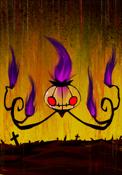 alternate_eye_color blank_eyes blood chandelure cross fire floating full_body gen_5_pokemon gradient_background graveyard horror_(theme) latin_cross looking_at_viewer nintendo pokemon purple_fire raining_blood red_eyes ribero straight-on tombstone yellow_background