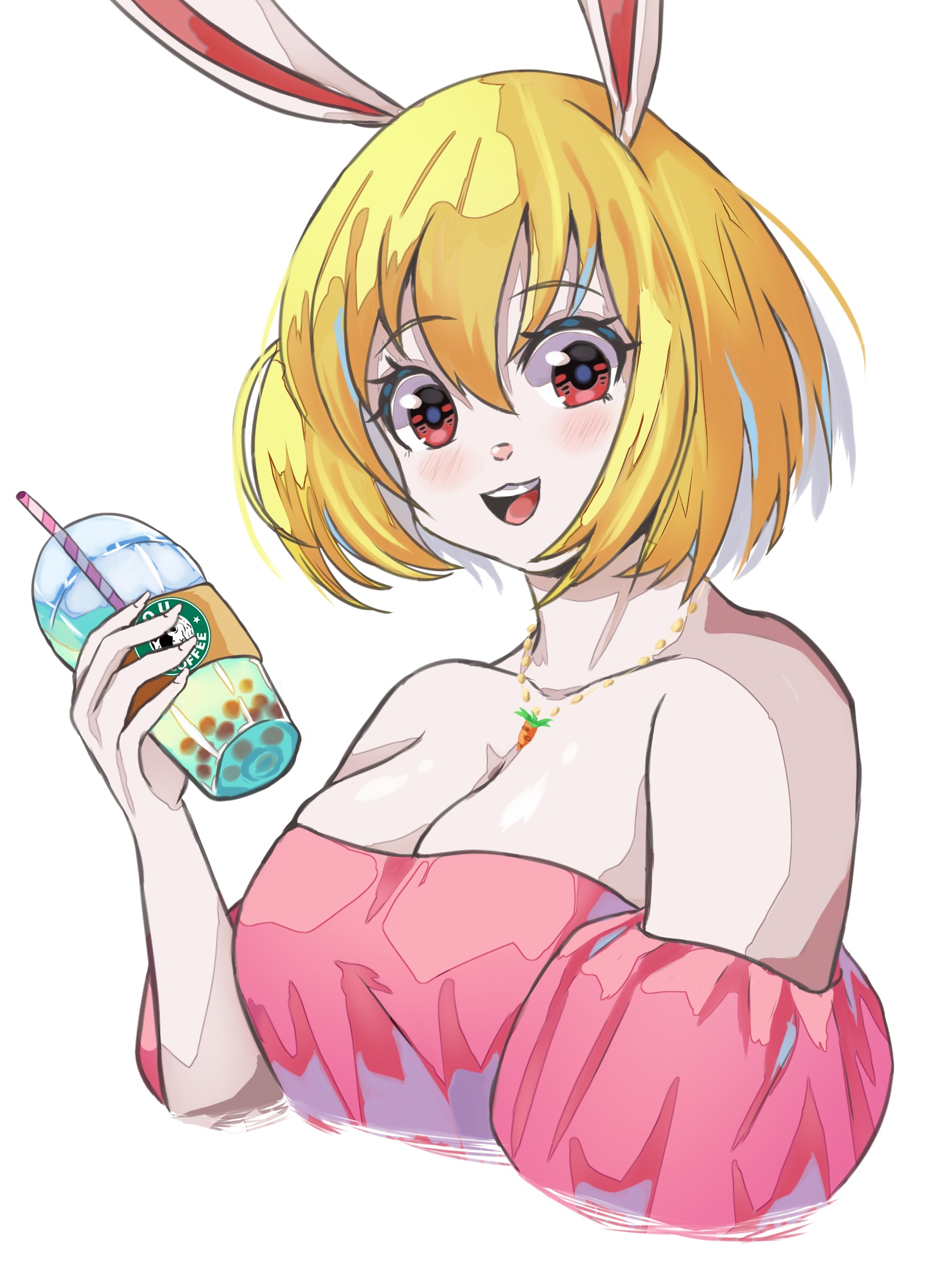 1girl bare_shoulders blonde_hair breasts bubble_tea carrot_(one_piece) cleavage drinking_straw highres jewelry klopsiak medium_breasts necklace one_piece open_mouth rabbit_ears rabbit_girl red_eyes shirt short_hair smile solo starbucks strapless strapless_shirt upper_body