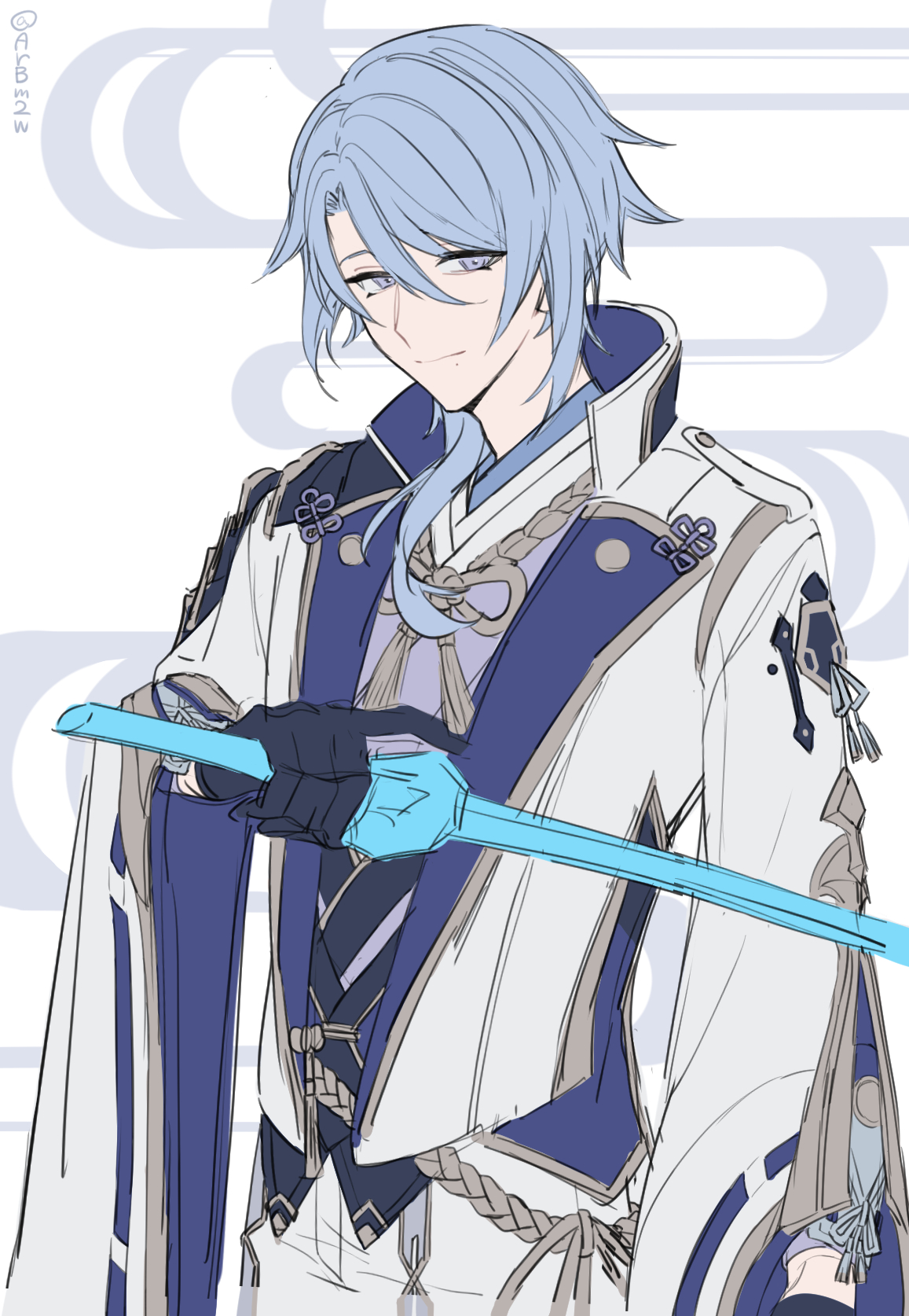 1boy armor blue_hair closed_mouth genshin_impact highres holding holding_sword holding_weapon japanese_armor japanese_clothes kamisato_ayato long_sleeves looking_at_viewer male_focus mole mole_under_mouth musou_(asatomjj) purple_eyes ribbon-trimmed_sleeves ribbon_trim simple_background solo sword tassel twitter_username upper_body weapon wide_sleeves