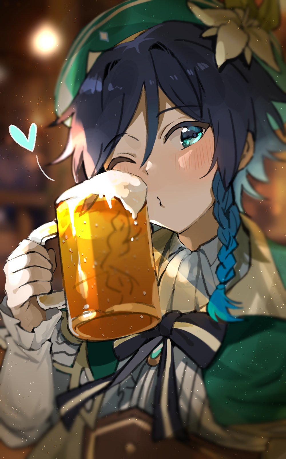 1boy alcohol beer beer_mug black_hair blue_hair blush bow braid cup flower foam genshin_impact gradient_hair green_hat gyoju_(only_arme_nim) hair_between_eyes hat heart highres holding holding_cup long_sleeves looking_at_viewer male_focus mug multicolored_hair one_eye_closed puckered_lips revision solo twin_braids venti_(genshin_impact) white_flower