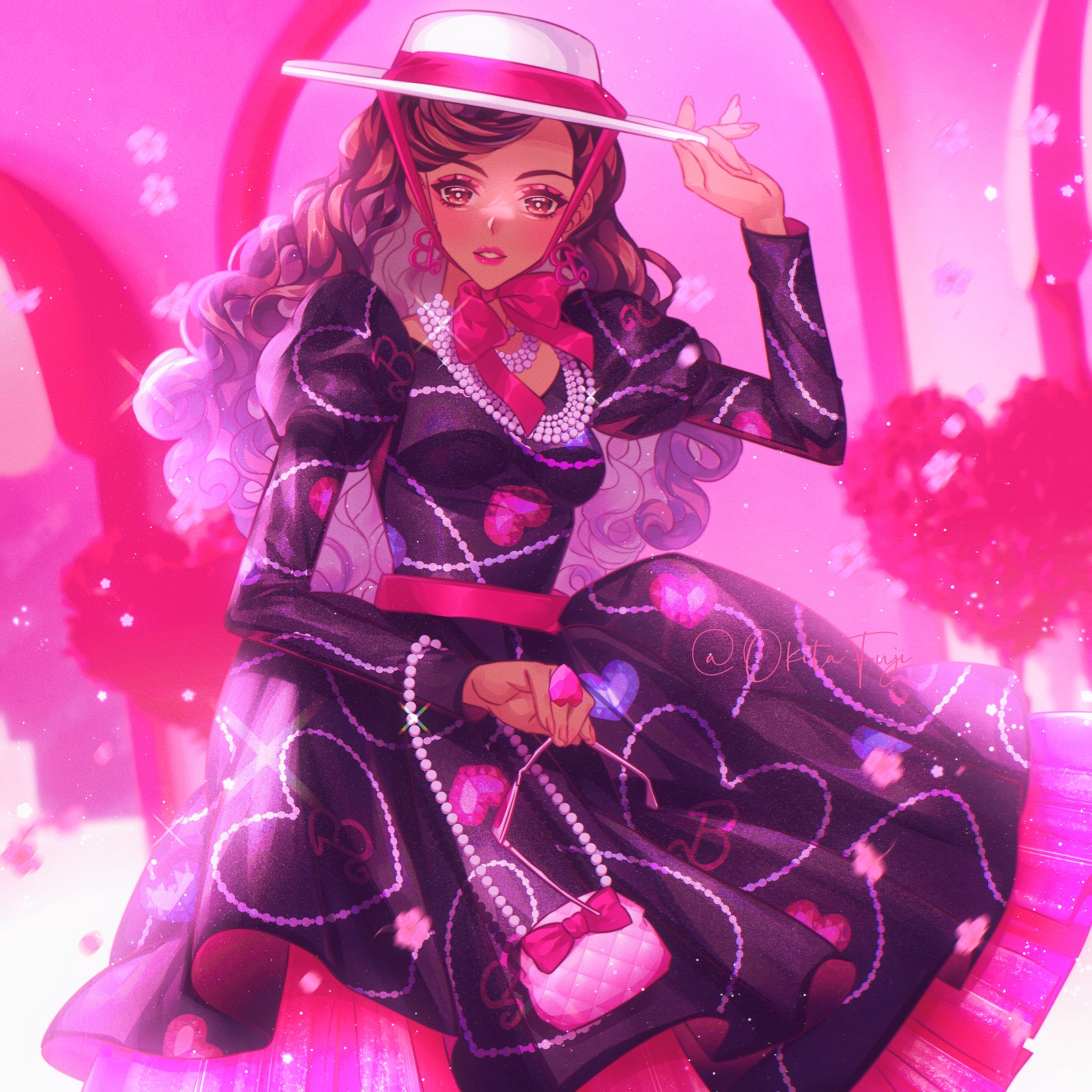1950s_(fashion) 1950s_(style) 1girl bag barbie_(franchise) bow breasts brown_eyes brown_hair curly_hair dark-skinned_female dark_skin doll dress fashion frills gem gradient_hair handbag hat hat_ribbon heart highres jewelry juliet_sleeves long_hair long_sleeves medium_breasts multicolored_hair necklace okitafuji patterned_clothing pearl_(gemstone) pearl_necklace pink_background pink_bow pink_hair pink_theme print_dress print_skirt puffy_sleeves ribbon skirt solo toy vintage_clothes