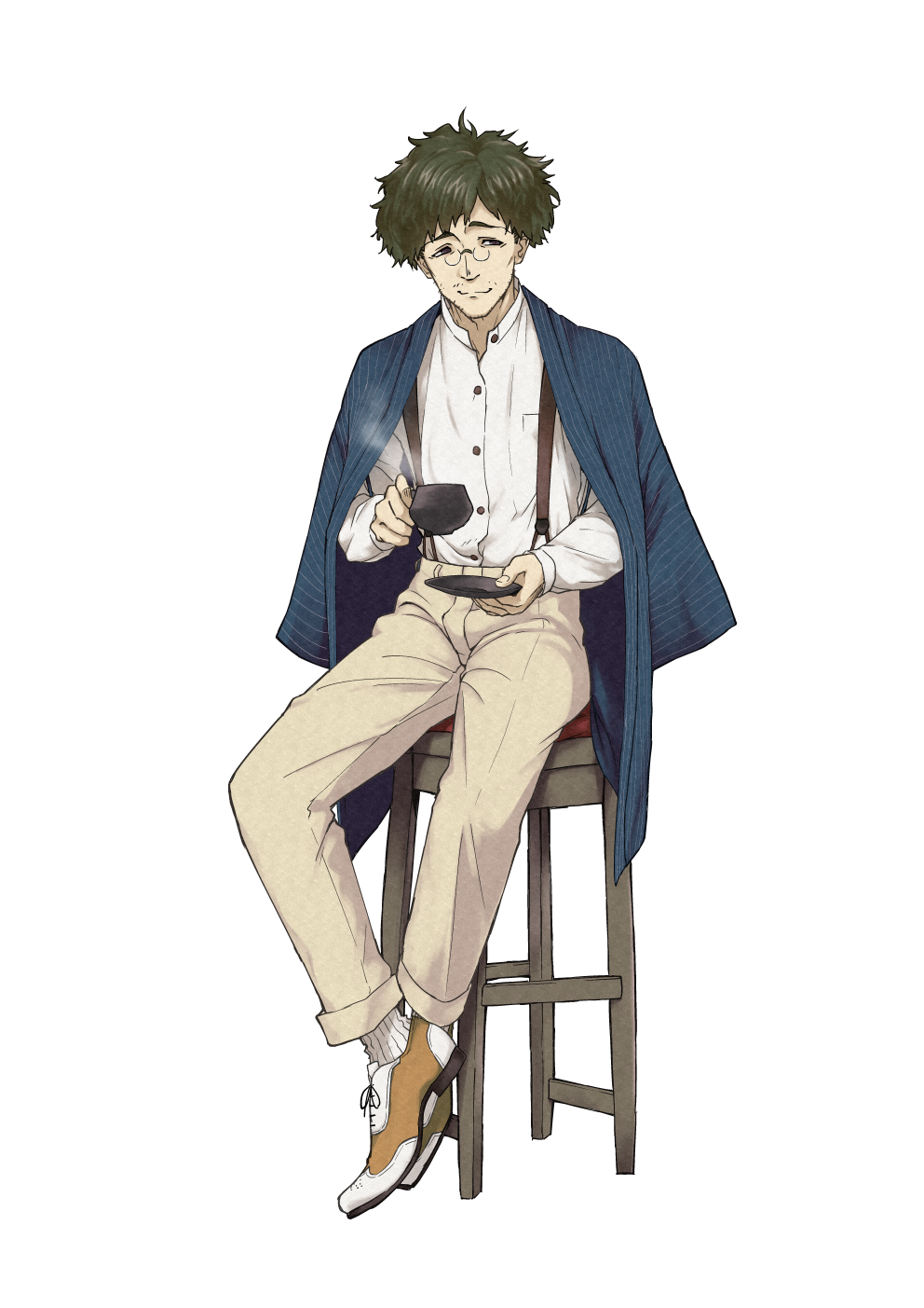 1boy black_eyes chair dark_green_hair full_body glasses haori herio highres japanese_clothes long_sleeves male_focus on_chair original pants shirt shoes short_hair simple_background sitting socks solo suspenders white_background white_shirt white_socks