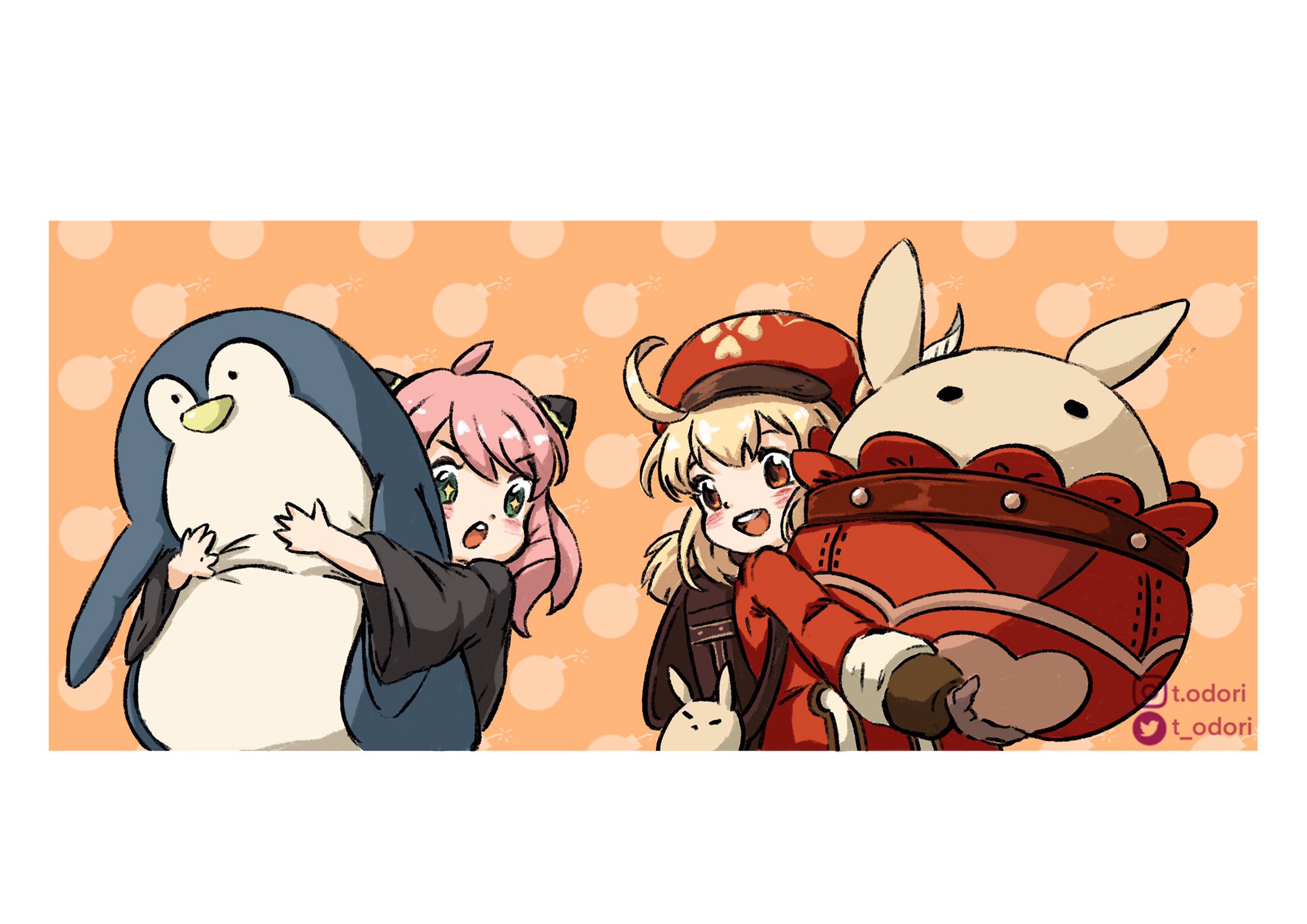 2girls :d ahoge anya_(spy_x_family) backpack bag bag_charm black_shirt brown_gloves brown_scarf newsboy_cap carrying charm_(object) child clover_print coat commentary crossover dodoco_(genshin_impact) double_bun english_commentary genshin_impact gloves green_eyes hair_between_eyes hair_bun hat hat_feather hat_ornament highres hugging_doll hugging_object jumpy_dumpty klee_(genshin_impact) light_brown_hair long_hair long_sleeves looking_at_another low_twintails multiple_girls open_mouth orange_background orange_eyes pink_hair polka_dot polka_dot_background randoseru red_coat red_headwear scarf shirt short_hair sidelocks simple_background smile spy_x_family stuffed_animal stuffed_penguin stuffed_toy t.odori twintails