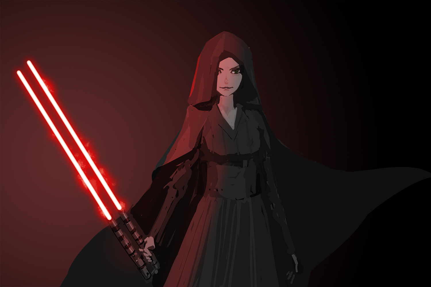 1girl animification black_dress black_eyes breasts double_blade dress energy_sword holding holding_sword holding_weapon hood hood_up inata_wataru lightsaber medium_breasts rey_(star_wars) smile solo star_wars star_wars:_the_rise_of_skywalker sword v-shaped_eyebrows weapon