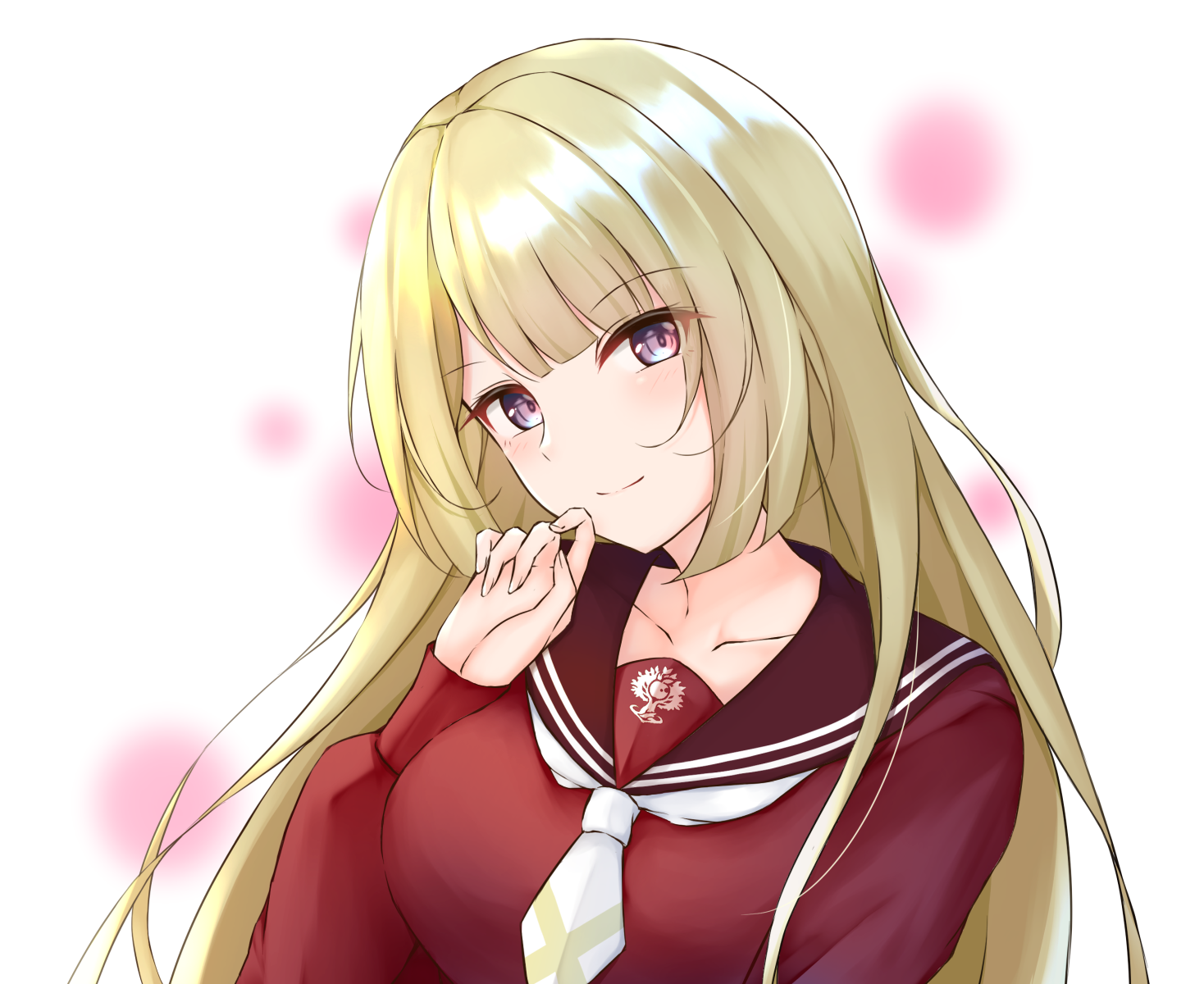1girl 7-mzk assault_lily blonde_hair blunt_bangs blurry blurry_background blush breasts brown_sailor_collar closed_mouth collarbone commentary_request fingernails hand_to_own_mouth hand_up head_tilt highres kanba_girls_high_school_uniform long_hair long_sleeves looking_at_viewer medium_breasts miyagawa_takane necktie purple_eyes sailor_collar school_uniform serafuku short_necktie smile solo upper_body white_background white_necktie
