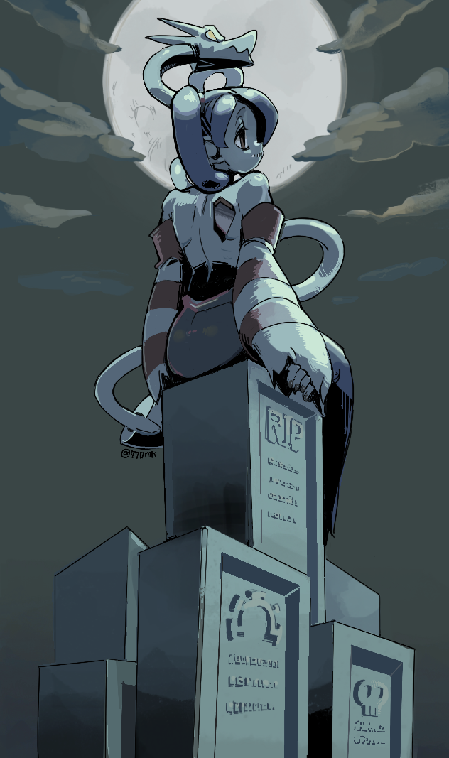 1girl 770mk blue_hair blue_skin cloud colored_skin dress exposed_bone from_behind full_moon grave hair_over_one_eye moon night red_eyes side_ponytail sitting skullgirls solo squigly_(skullgirls) tombstone zombie