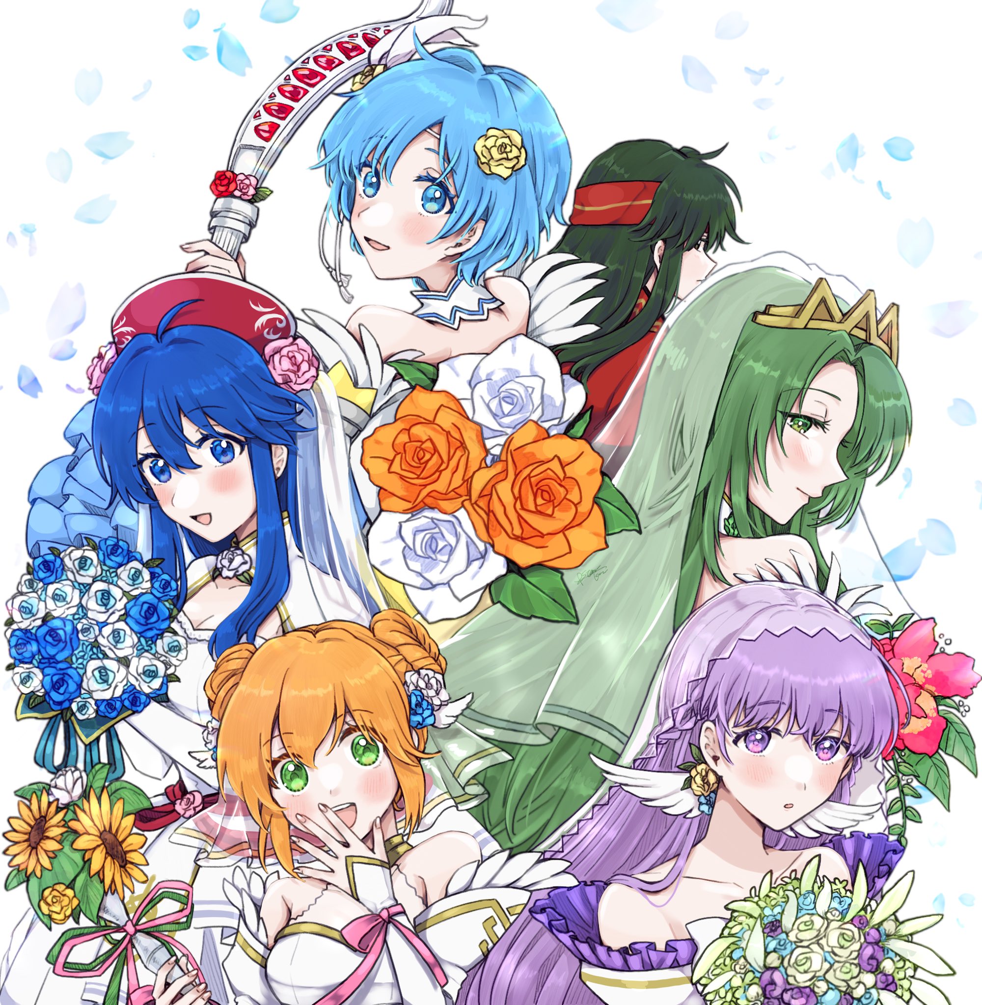 6+girls bare_shoulders blue_eyes blue_hair blush bouquet bow_(weapon) bridal_gauntlets cecilia_(bridal)_(fire_emblem) cecilia_(fire_emblem) collarbone double_bun dress falling_petals fire_emblem fire_emblem:_the_binding_blade fire_emblem_heroes flower frills green_eyes green_hair hair_bun hat headband highres holding holding_bouquet larum_(bridal)_(fire_emblem) larum_(fire_emblem) lilina_(bridal)_(fire_emblem) lilina_(fire_emblem) long_hair looking_at_viewer looking_back misato_hao multiple_girls nintendo official_alternate_costume orange_hair petals purple_eyes purple_hair shanna_(bridal)_(fire_emblem) shanna_(fire_emblem) short_hair simple_background smile sophia_(bridal)_(fire_emblem) sophia_(fire_emblem) sue_(fire_emblem) veil very_long_hair weapon wedding_dress white_background white_dress