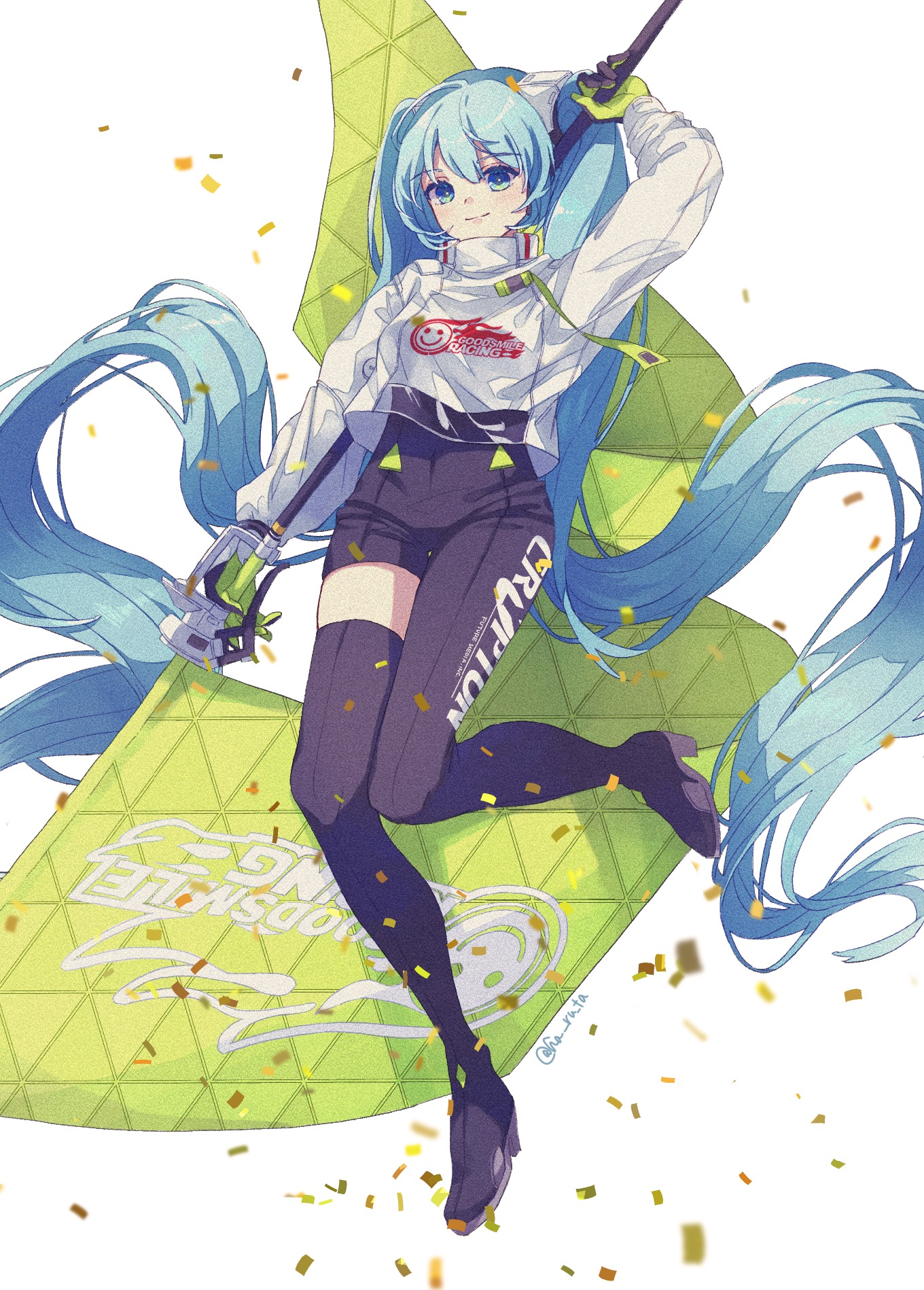 1girl absurdly_long_hair aqua_eyes aqua_hair flag goodsmile_company goodsmile_racing haruta_(user_dndp3458) hatsune_miku highres holding holding_flag long_hair looking_at_viewer racing_miku racing_miku_(2022) solo standing standing_on_one_leg very_long_hair vocaloid