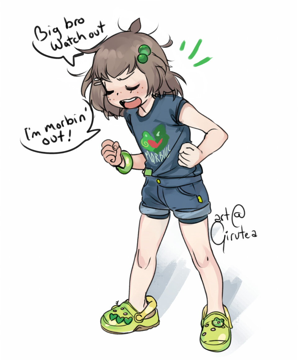 ! 1girl ahoge alternate_costume blue_legwear blue_shirt blue_shorts blush brown_hair buttons child closed_eyes crocs denim denim_shorts english_text female_focus fingernails freckles frog frog_pin full_body girutea green_footwear green_hair_ornament hair_ornament hairclip heart indie_virtual_youtuber it's_morbin'_time_(meme) jeans knees legs lily_hopkins marvel medium_hair meme merchandise messy_hair morbius_(movie) neck nose open_mouth pants pocket print_shirt shadow shirt shirt_tucked_in short-sleeved_shirt short_sleeves shorts signature simple_background solo sony's_spider-man_universe speech_bubble spider-man_(series) standing t-shirt teeth tongue upper_teeth_only virtual_youtuber white_background