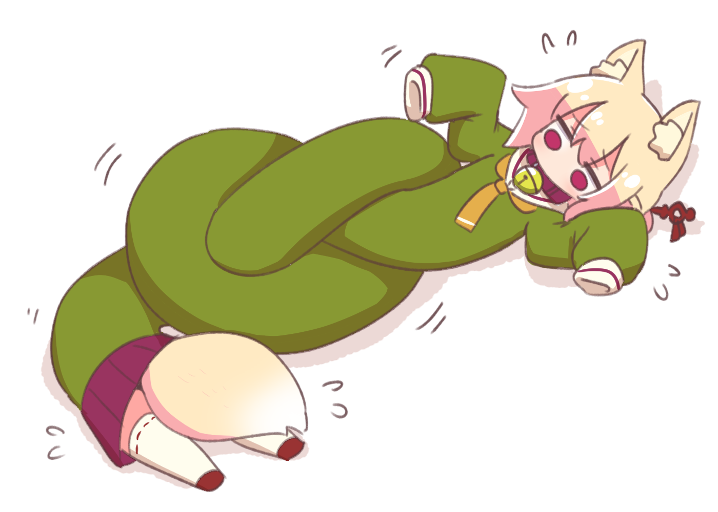 1girl anatomical_nonsense animal_ear_fluff animal_ears bad_anatomy bell brown_footwear collar flying_sweatdrops fox_ears fox_girl fox_tail full_body green_shirt hair_bun hair_ornament jitome kemomimi-chan_(naga_u) knot long_sleeves motion_lines naga_u neck_bell necktie orange_necktie original pleated_skirt purple_collar purple_eyes purple_skirt ribbon-trimmed_legwear ribbon_trim sailor_collar shirt single_hair_bun skirt sleeves_past_fingers sleeves_past_wrists solo tail thighhighs white_background white_sailor_collar white_thighhighs