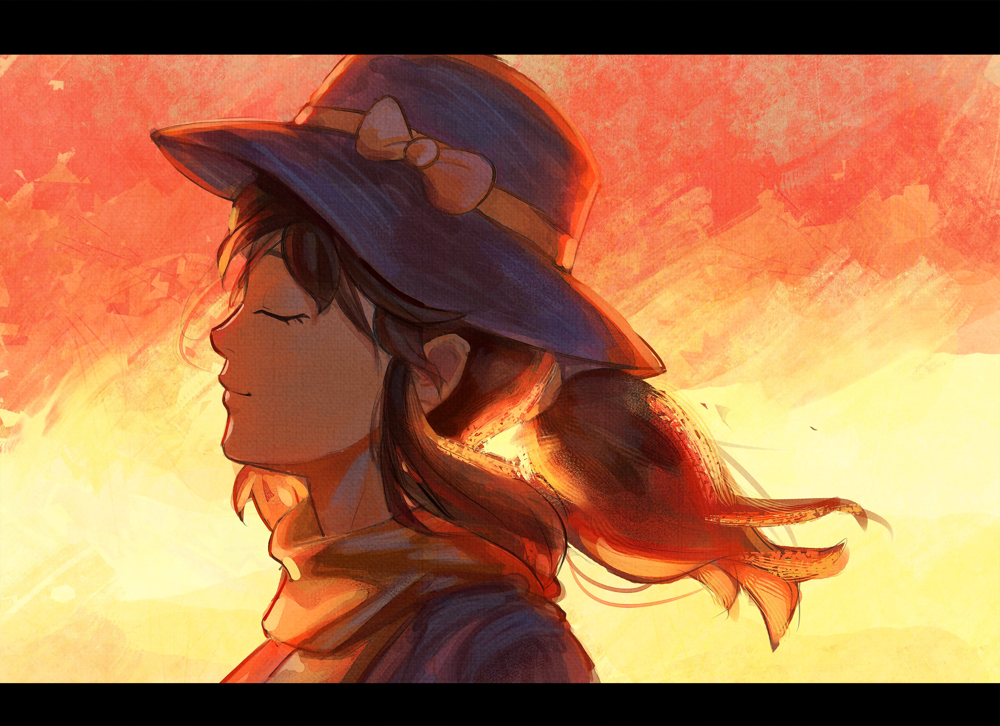 a_hat_in_time absurdres aged_up bow brown_hair closed_eyes coat hat hat_kid highres hilbert_hitchcock letterboxed ponytail purple_coat purple_headwear scarf smile yellow_bow yellow_scarf