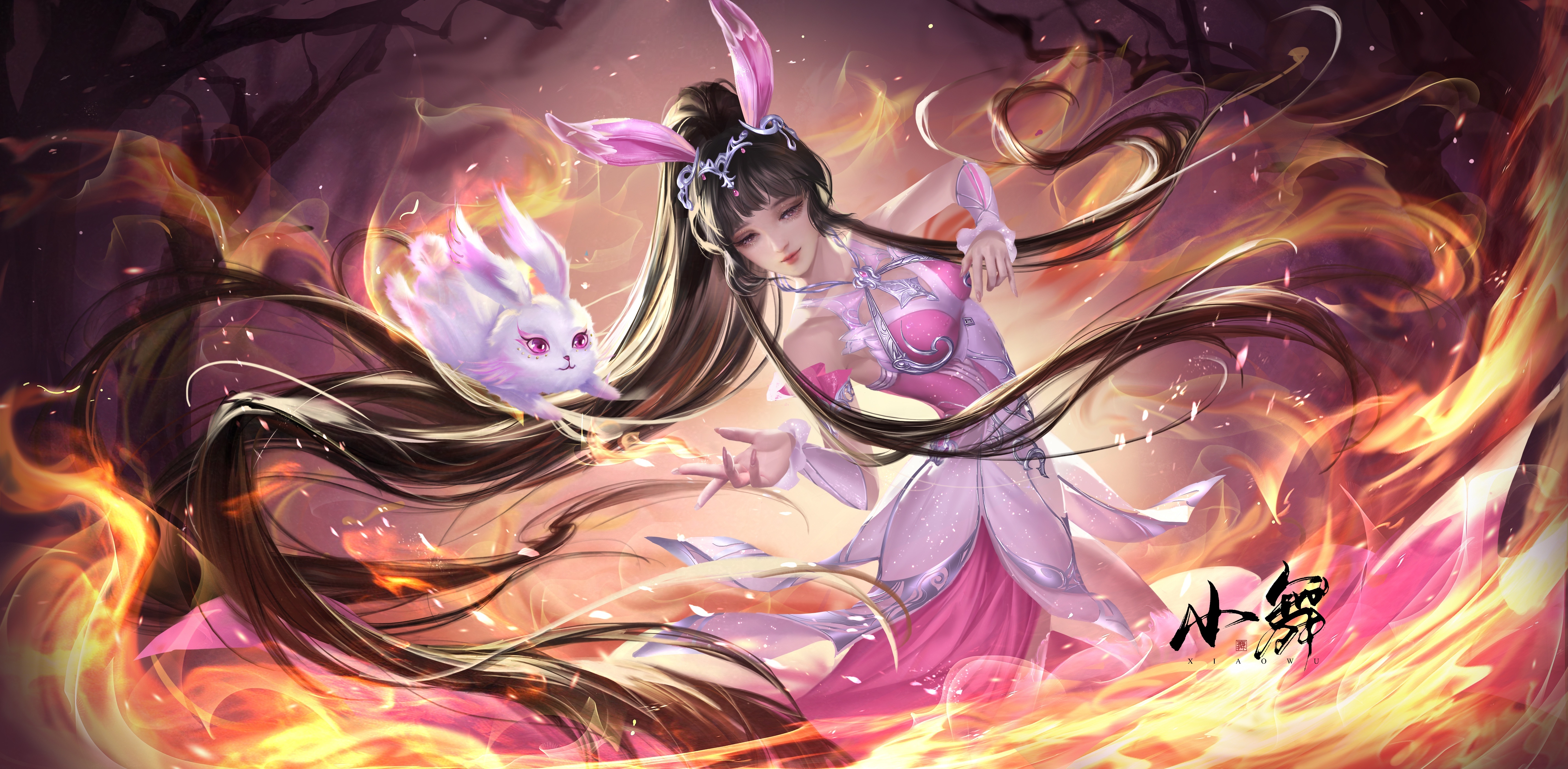 1girl absurdres animal_ears bare_tree brown_hair closed_mouth douluo_dalu douluo_dalu_xiaowu_zhuye dress fire hair_ornament highres looking_down pink_dress ponytail rabbit rabbit_ears smile tree upper_body xiao_wu xiao_wu_(douluo_dalu)