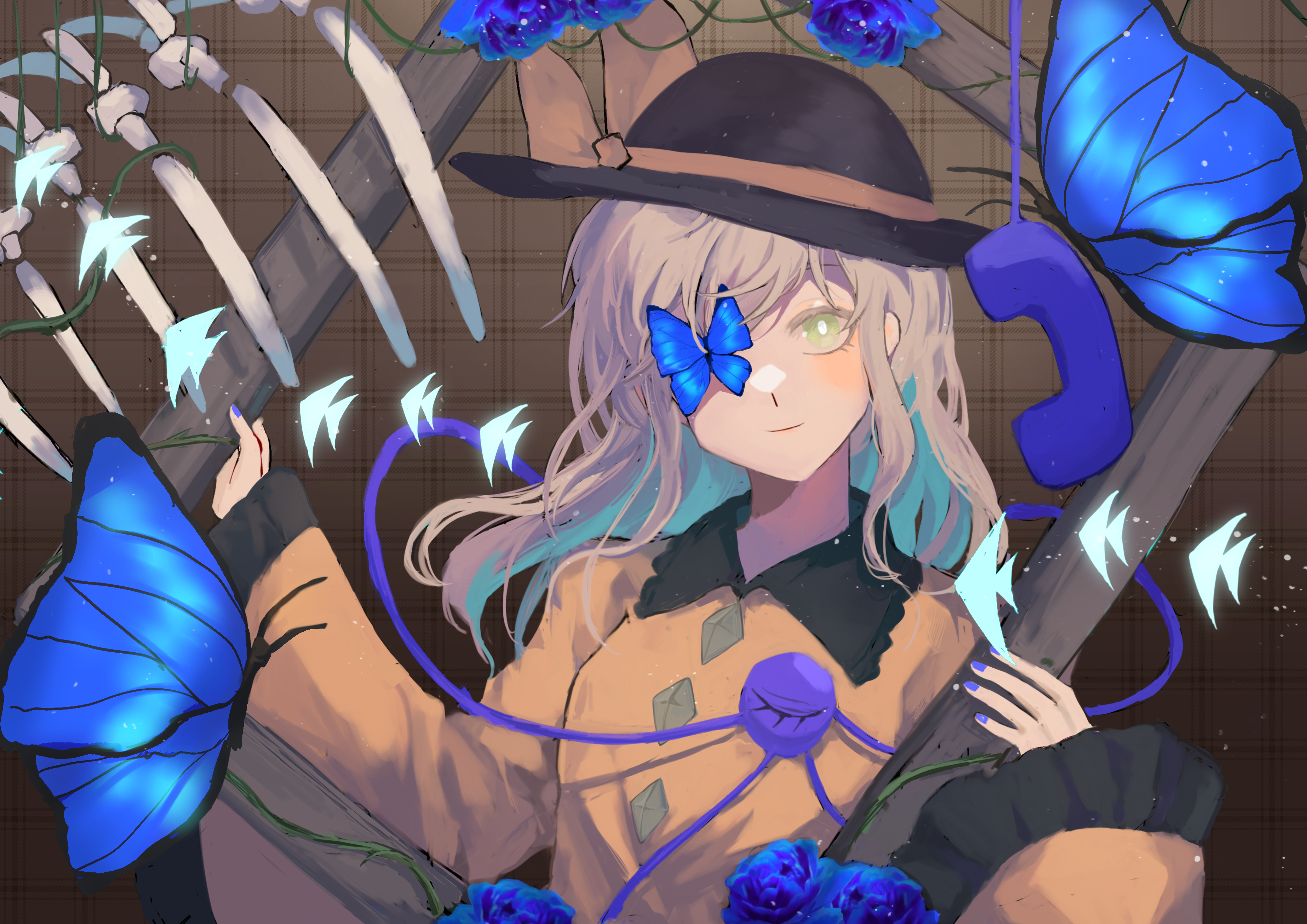1girl absurdres angelfish black_hat blouse blue_butterfly blue_flower blue_nails blue_rose blush bow bug butterfly buttons chinese_commentary closed_mouth commentary corded_phone diamond_button empty_picture_frame eyebrows_hidden_by_hair fingernails fish flower frilled_sleeves frills green_eyes hat hat_bow highres holding holding_picture_frame insect komeiji_koishi light_green_hair long_sleeves looking_at_viewer nail_polish one_eye_covered phone picture_frame ribs rose shirt smile third_eye touhou upper_body wane_(vitamin) wide_sleeves yellow_bow yellow_shirt