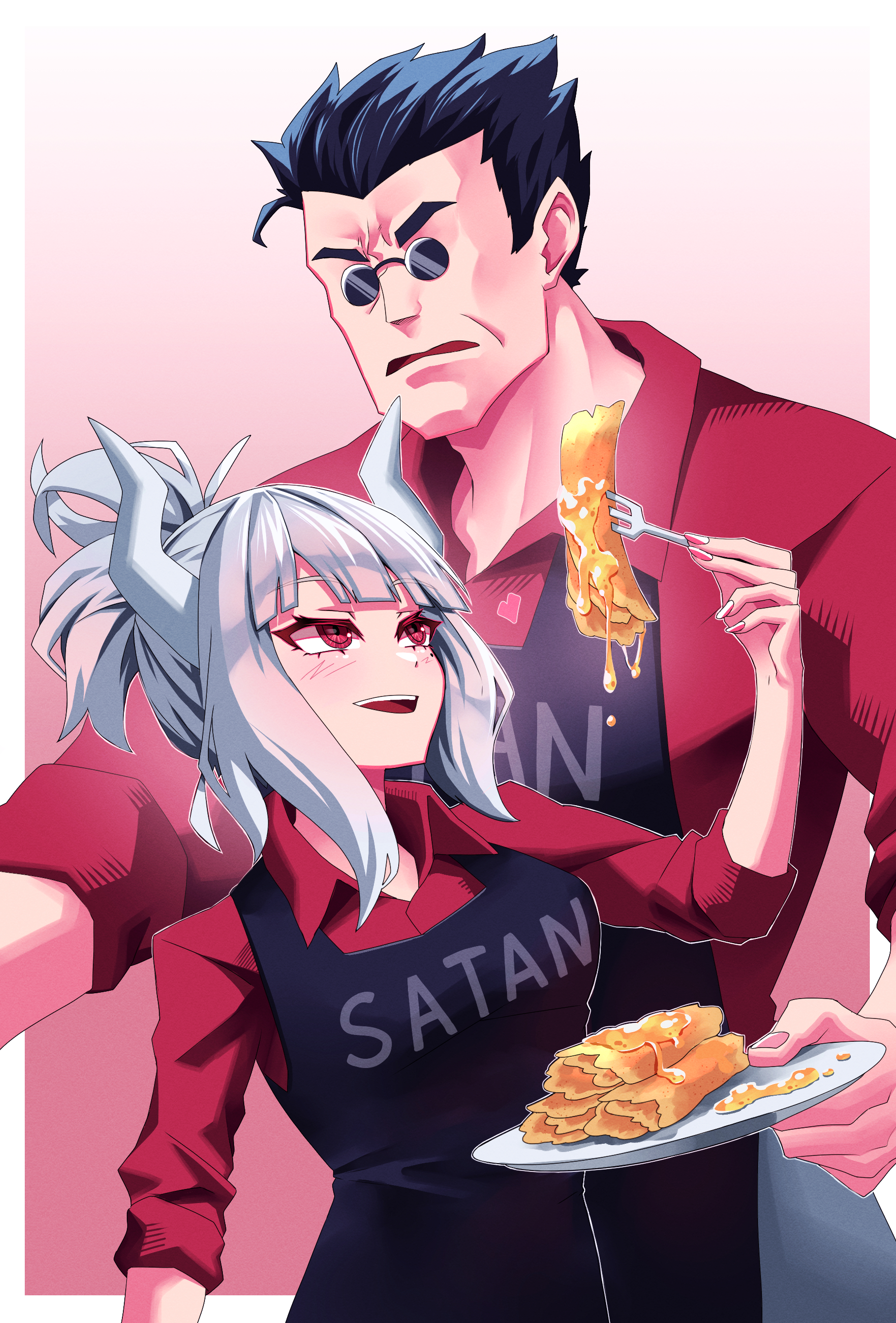1boy 1girl absurdres apron black_hair blush demon_girl demon_horns food helltaker helltaker_(character) highres horns lucifer_(helltaker) mole mole_under_eye pancake red_eyes red_shirt shirt size_difference sunglasses white_hair yumesphere