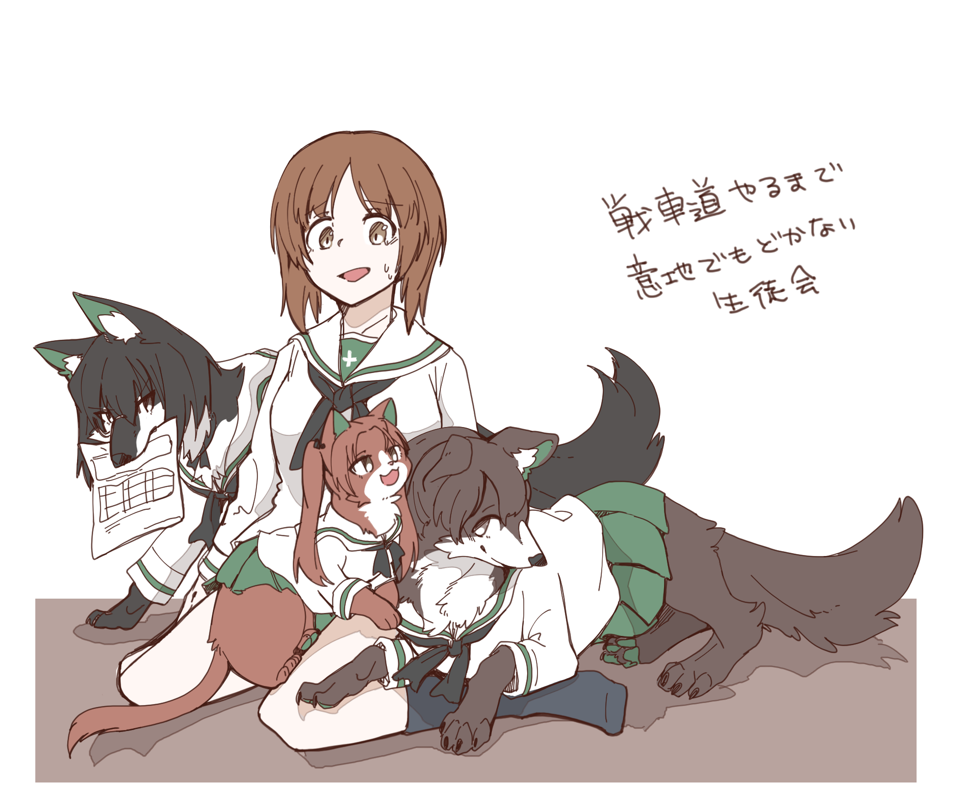 1girl animal animal_on_lap animalization black_hair black_legwear black_neckerchief blouse brown_eyes brown_hair cat closed_mouth commentary dog girls_und_panzer green_skirt grey-framed_eyewear hasekura_(hachinochun) highres kadotani_anzu kawashima_momo koyama_yuzu long_hair long_sleeves looking_at_another miniskirt monocle mouth_hold neckerchief nishizumi_miho no_shoes on_lap ooarai_school_uniform open_mouth pleated_skirt sailor_collar school_uniform semi-rimless_eyewear serafuku shirt short_hair sitting skirt smile socks sweatdrop translated twintails under-rim_eyewear wariza white_background white_sailor_collar white_shirt