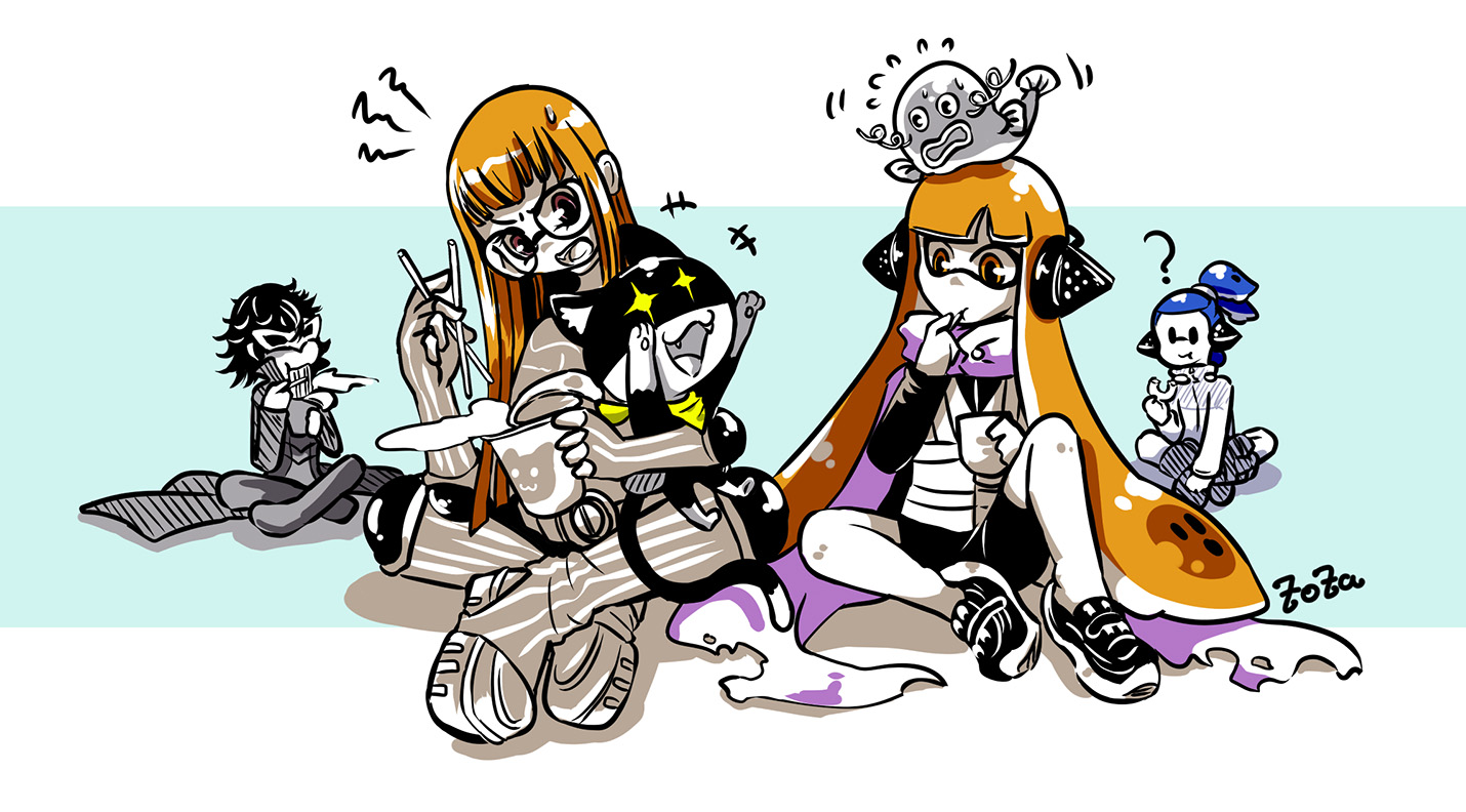 +++ +_+ 2boys 2girls ? amamiya_ren animal animal_on_head black_hair blue_hair blunt_bangs bodysuit boots cape cat chopsticks crossover cup instant_cup_noodles donut donut_(zoza) eating flying_sweatdrops food frown fume glasses headgear holding holding_animal holding_chopsticks holding_cup indian_style instant_cup_noodles instant_noodles knee_boots long_hair mask morgana_(persona_5) motion_lines multiple_boys multiple_girls nintendo no_socks on_head open_mouth orange_eyes original partially_colored persona persona_5 pudding pudding_(zoza) rimless_eyewear round_eyewear sakura_futaba scrunchie shoes short_hair sitting sneakers solid_oval_eyes splatoon_(series) splatoon_1 squidbeak_splatoon sweatdrop topknot torn_cape torn_clothes vest zapfish zoza