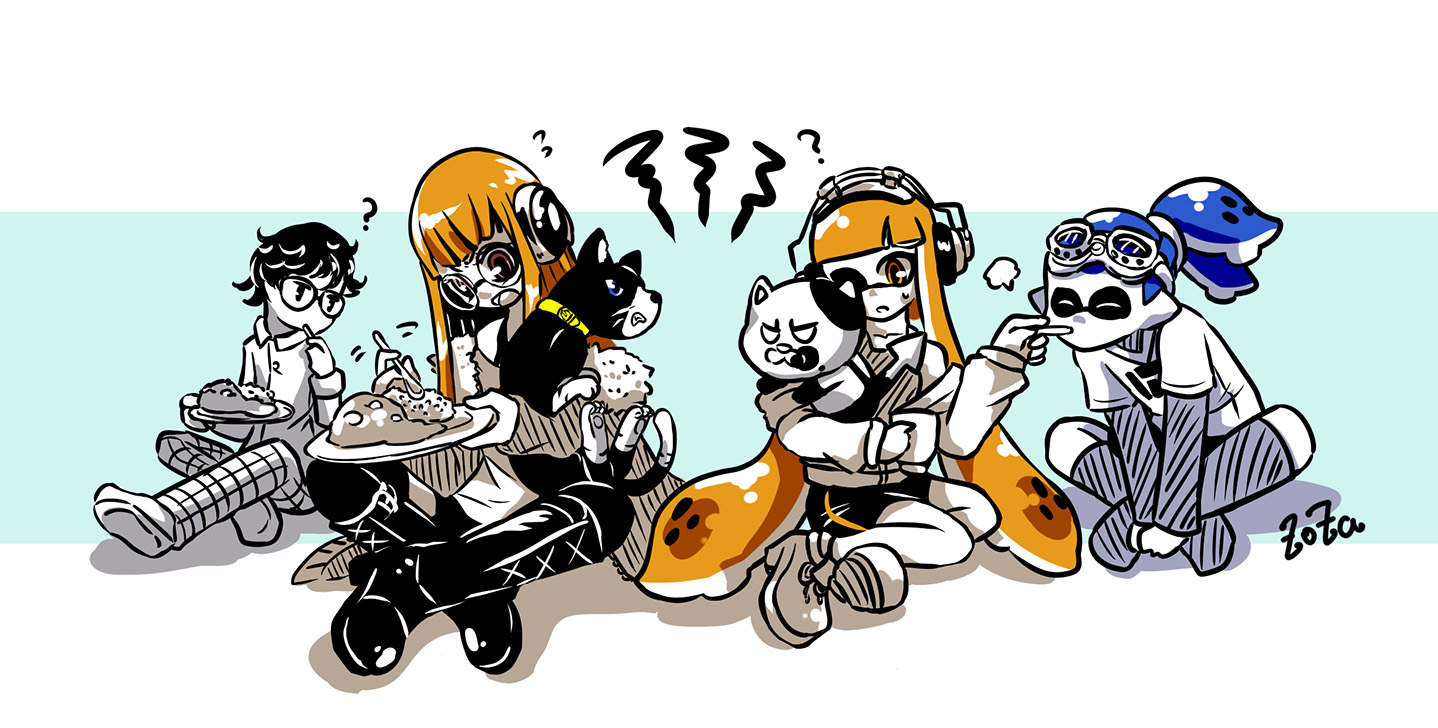 2boys 2girls amamiya_ren animal bike_shorts black_hair black_shorts blank_eyes blue_hair blunt_bangs boots cat closed_eyes commentary crossover cup curry curry_rice donut_(zoza) eating feeding flying_sweatdrops food frown fume glasses headphones holding holding_animal holding_cup holding_plate holding_spoon hood hoodie indian_style judd_(splatoon) lace-up_boots layered_sleeves leaning_forward long_hair long_sleeves morgana_(cat)_(persona_5) morgana_(persona_5) motion_lines multiple_boys multiple_girls nintendo off_shoulder one_eye_closed open_mouth orange_eyes original partially_colored persona persona_5 plate pointy_ears pudding_(zoza) rice rimless_eyewear round_eyewear sakura_futaba scrunchie shoes short_hair short_over_long_sleeves short_sleeves shorts sitting sneakers splatoon_(series) spoon thigh_gap topknot v-shaped_eyes v_arms yokozuwari zoza