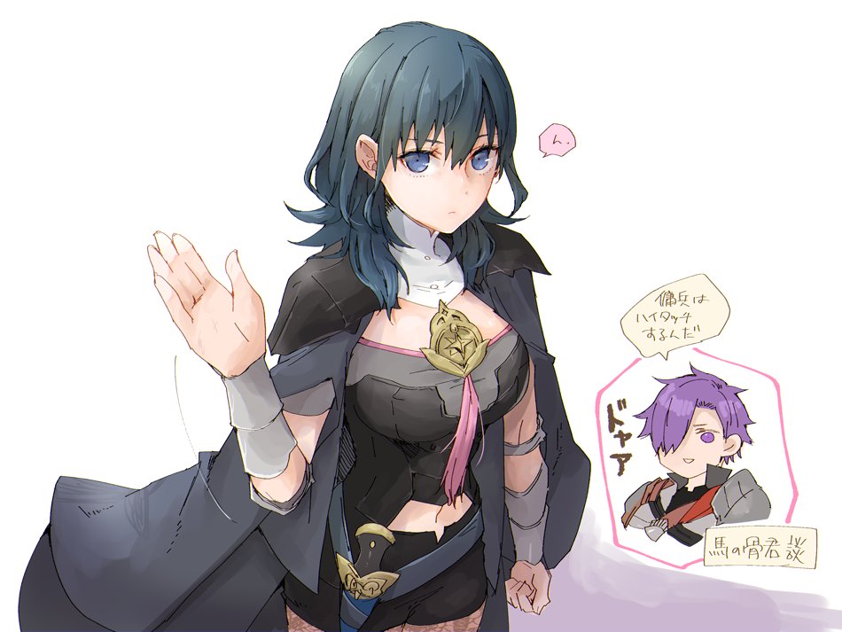 1boy 1girl armlet armor blue_eyes breasts cape closed_mouth female_byleth_(fire_emblem) fire_emblem fire_emblem:_three_houses fire_emblem_warriors:_three_hopes gloves hair_ornament hair_over_one_eye holding jewelry lace lace_pantyhose large_breasts long_hair looking_at_viewer male_shez_(fire_emblem) medium_breasts medium_hair nintendo pantyhose pantyhose_under_shorts purple_eyes purple_hair robaco short_hair shorts simple_background translation_request
