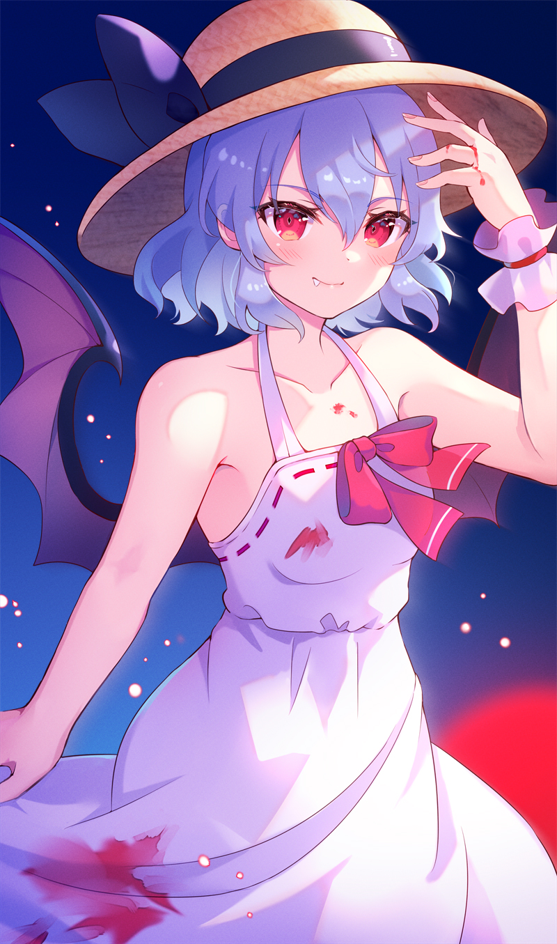 1girl 60mai adapted_costume alternate_headwear armpit_peek bare_shoulders bat_wings blood blood_stain blue_hair collarbone dress fang fang_out hat highres moon night outdoors red_eyes red_moon remilia_scarlet short_hair sky smile solo touhou white_dress wings