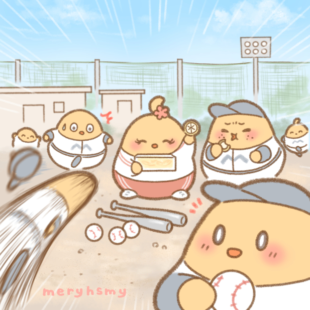 artist_name azur_lane baseball baseball_bat baseball_cap baseball_jersey baseball_stadium baseball_uniform eating hat hoshimiya_mery jersey manjuu_(azur_lane) mutsuki_face_(azur_lane) net no_humans outdoors pitching sportswear