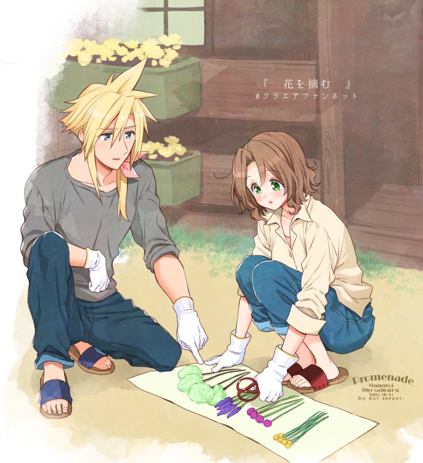 aerith_gainsborough alternate_costume beige_shirt blonde_hair blue_eyes blush brown_hair cloud_strife denim final_fantasy final_fantasy_vii final_fantasy_vii_remake flower full_body gainsborough_house gloves green_eyes grey_shirt hair_between_eyes hair_ribbon house krudears long_sleeves low_ponytail outdoors pants parted_bangs pink_ribbon pointing ponytail ribbon sandals scissors shirt short_hair sitting sleeves_rolled_up spiked_hair square_enix squatting wavy_hair window
